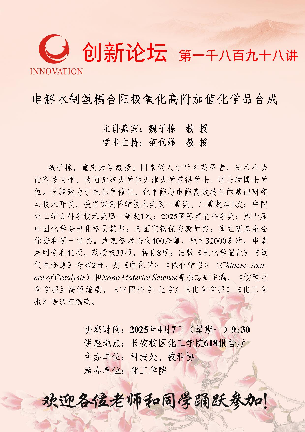 魏子栋 教授 必赢3003no1线路检测中心创新论坛第一千八百九十八讲:电解水制氢耦合阳极氧化高附加值化学品合成 讲座时间 2025年4月7日(星期一)9:30 讲座地点 长安校区化工学院618报告厅 讲座人介绍 魏子栋 教授 讲座内容