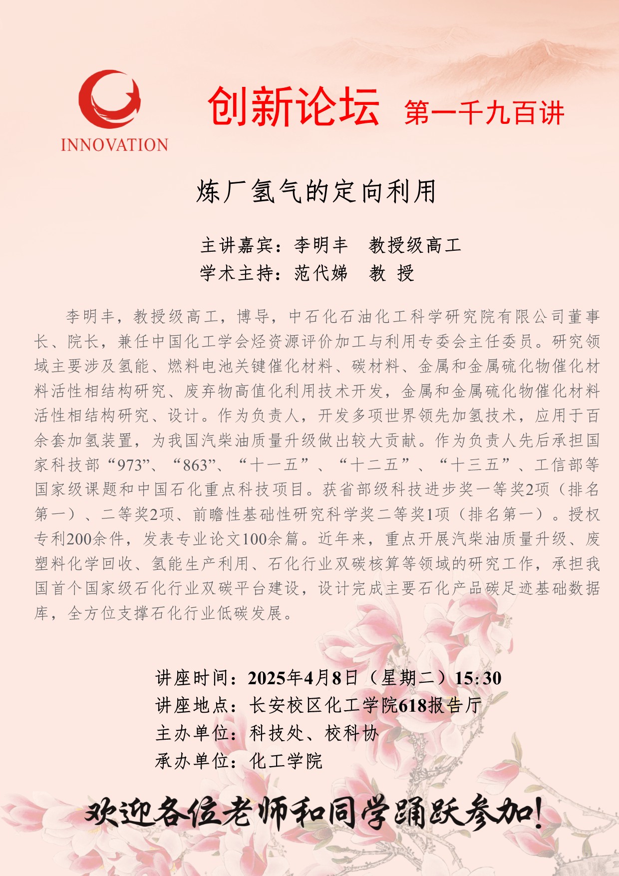 李明丰 教授级高工 必赢3003no1线路检测中心创新论坛第一千九百讲:炼厂氢气的定向利用 讲座时间 2025年4月8日(星期二)15:30 讲座地点 长安校区化工学院618报告厅 讲座人介绍 李明丰 教授级高工 讲座内容