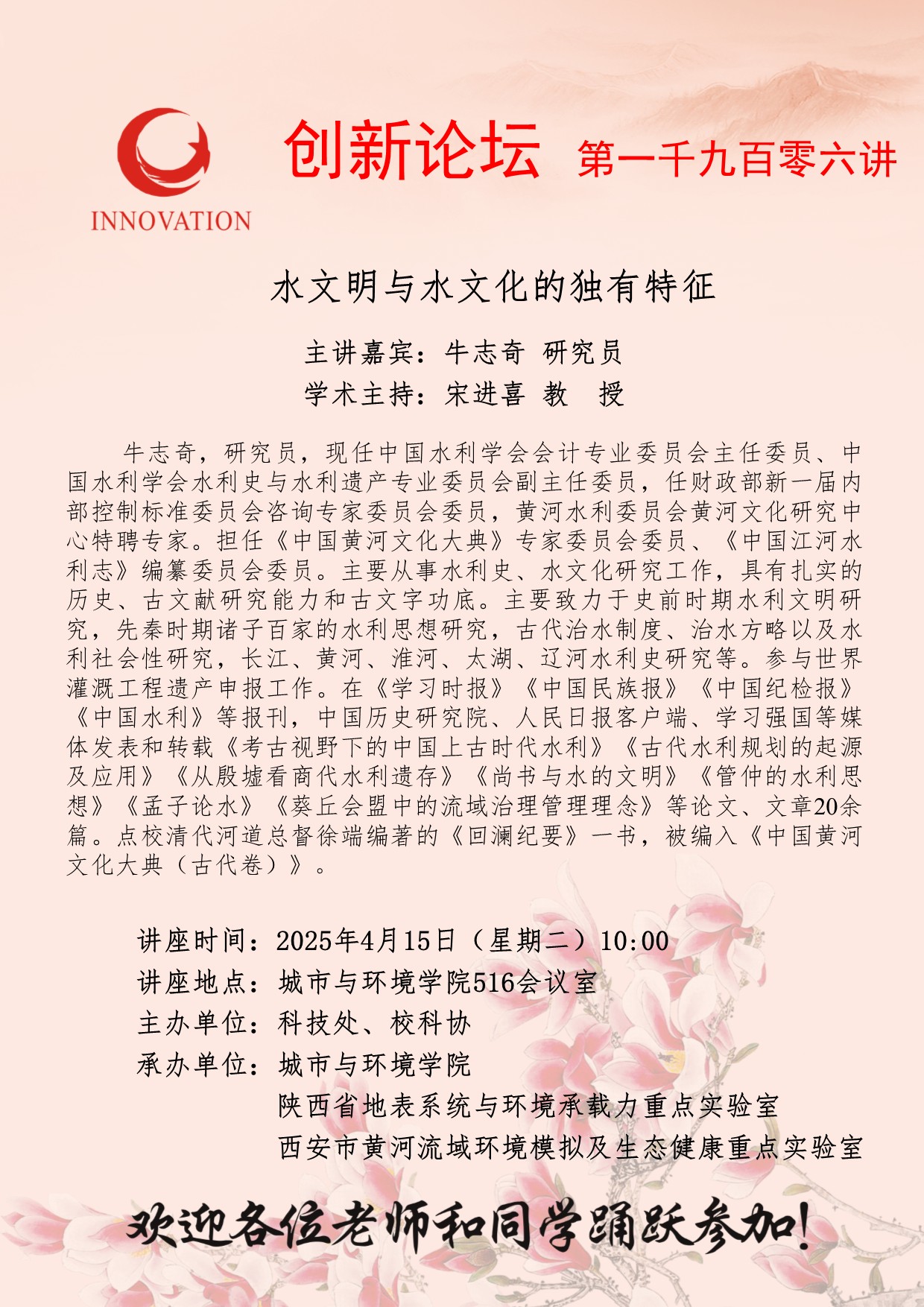 牛志奇 研究员 必赢3003no1线路检测中心创新论坛第一千九百零六讲:水文明与水文化的独有特征 讲座时间 2025年4月15日(星期二)10:00 讲座地点 城市与环境学院516会议室 讲座人介绍 牛志奇 研究员 讲座内容
