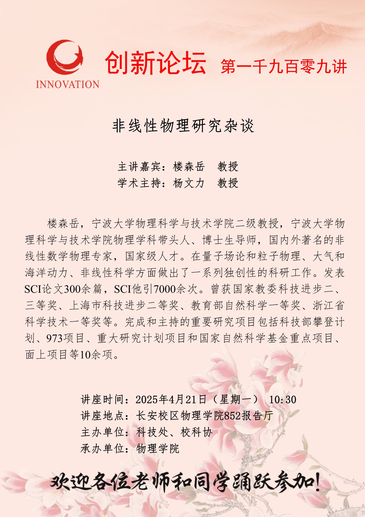 楼森岳 教授 必赢3003no1线路检测中心创新论坛第一千九百零九讲:非线性物理研究杂谈 讲座时间 2025年4月21日(星期一) 10:30 讲座地点 长安校区物理学院852报告厅 讲座人介绍 楼森岳 教授 讲座内容