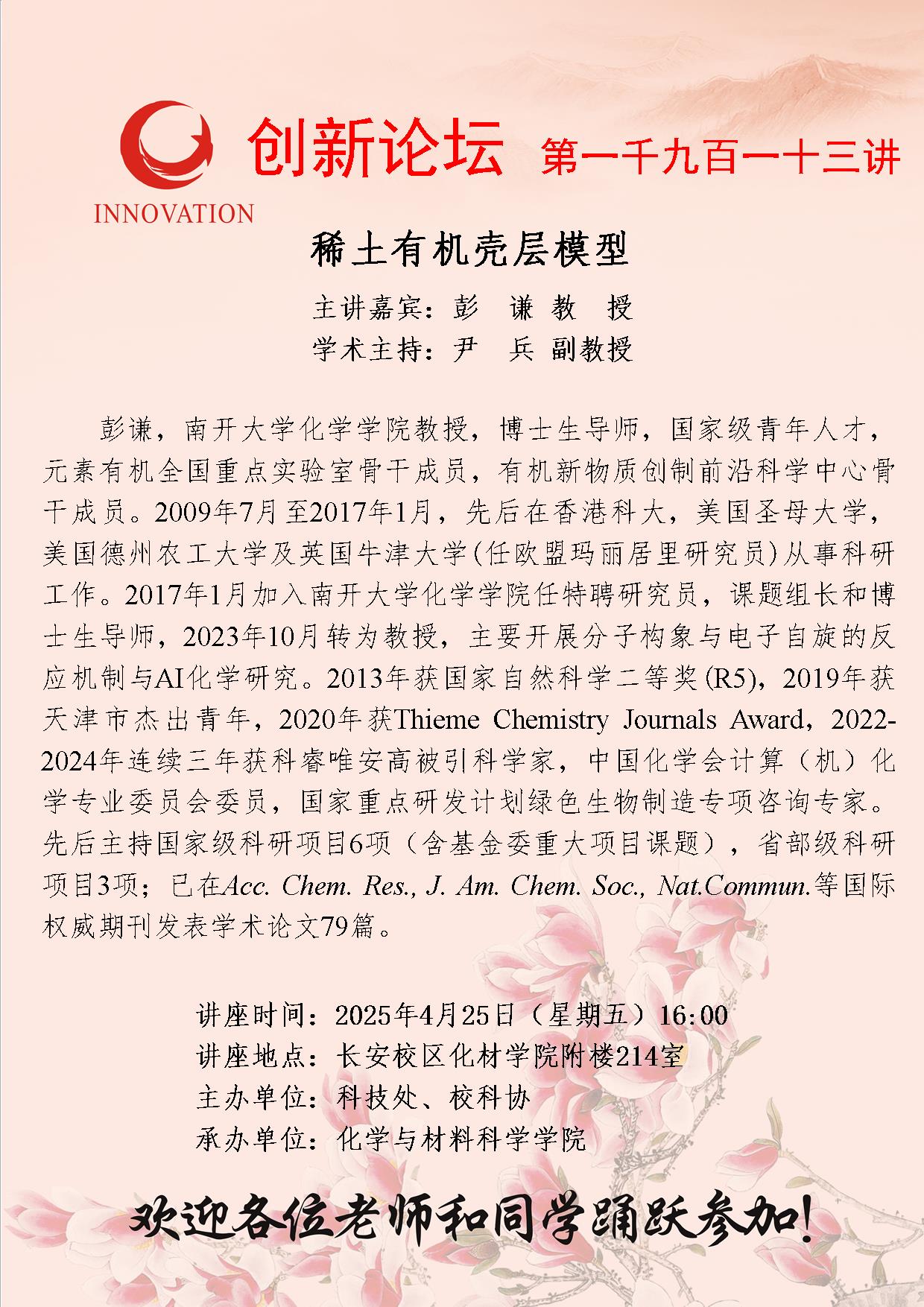 彭谦 教授 必赢3003no1线路检测中心创新论坛第一千九百一十三讲:稀土有机壳层模型 讲座时间 2025年4月25日(星期五)16:00 讲座地点 长安校区化材学院附楼214室 讲座人介绍 彭谦 教授 讲座内容