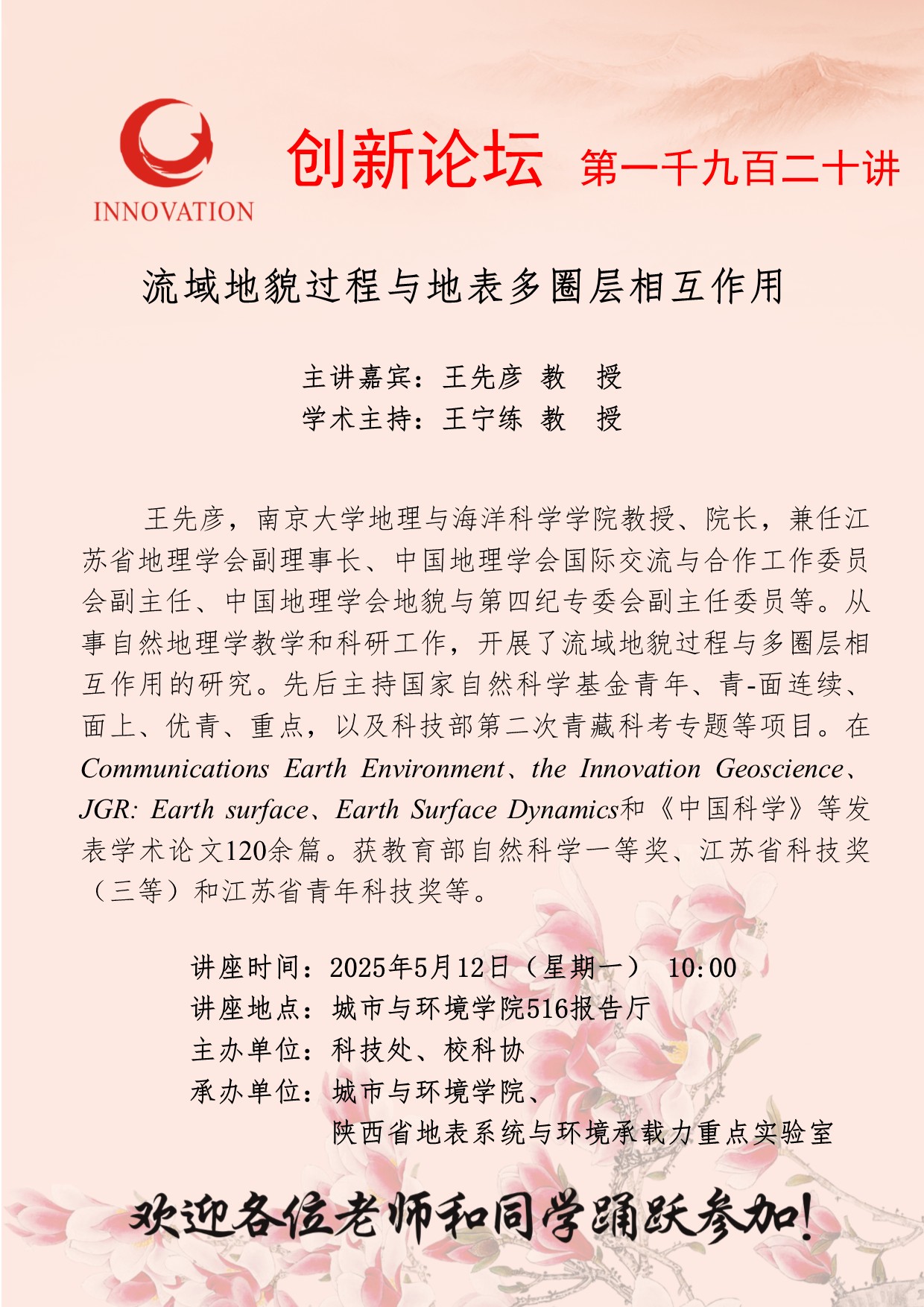 王先彦 教授 必赢3003no1线路检测中心创新论坛第一千九百二十讲:流域地貌过程与地表多圈层相互作用 讲座时间 2025年5月12日(星期一) 10:00 讲座地点 城市与环境学院516报告厅 讲座人介绍 王先彦 教授 讲座内容