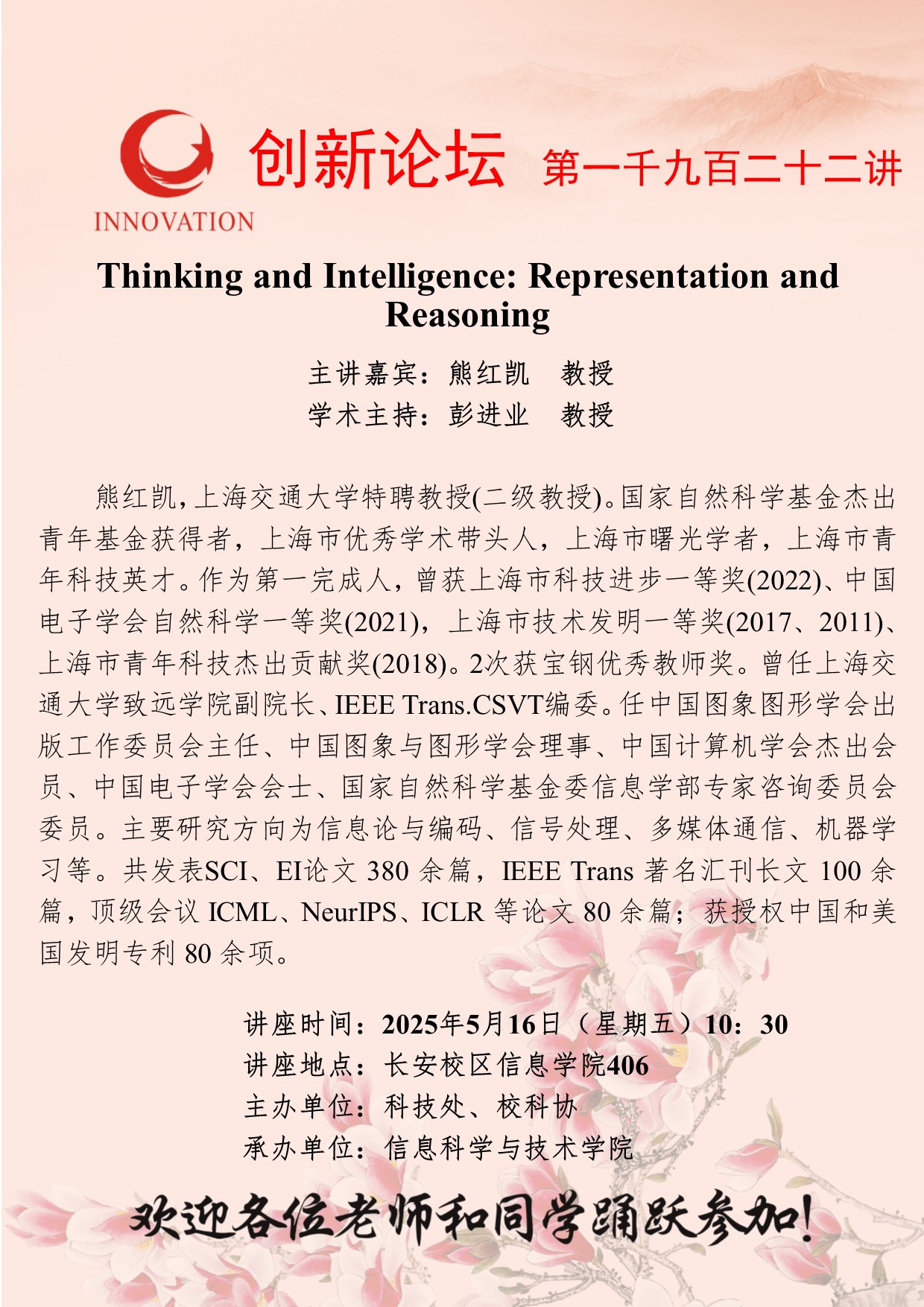 熊红凯 教授 必赢3003no1线路检测中心创新论坛第一千九百二十二讲:Thinking and Intelligence: Representation and Reasoning 讲座时间 2025年5月16日(星期五)10:30 讲座地点 长安校区信息学院406 讲座人介绍 熊红凯 教授 讲座内容