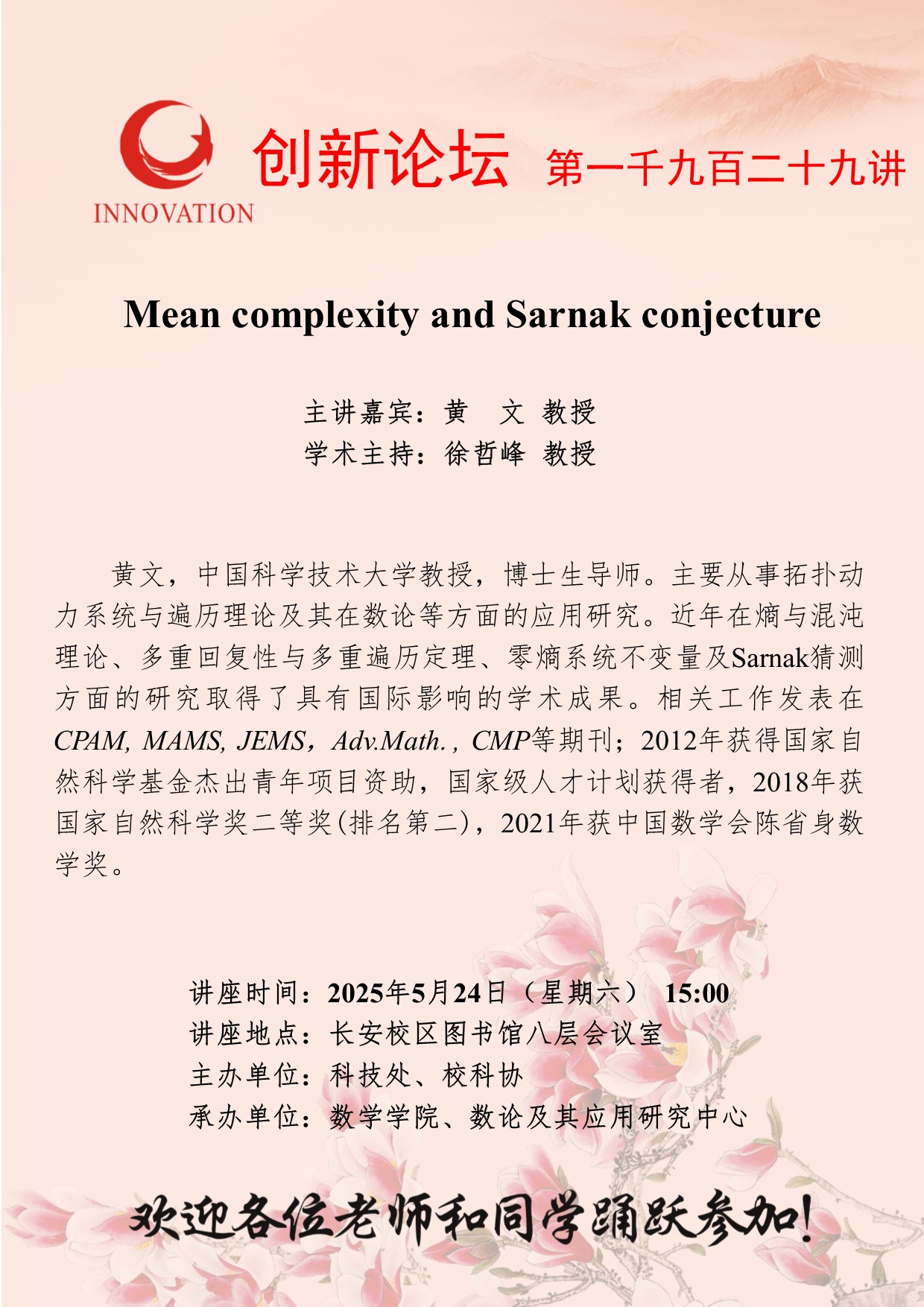 黄文 教授 必赢3003no1线路检测中心创新论坛第一千九百二十九讲:Mean complexity and Sarnak conjecture 讲座时间 2025年5月24日(星期六) 15:00 讲座地点 长安校区图书馆八层会议室 讲座人介绍 黄文 教授 讲座内容