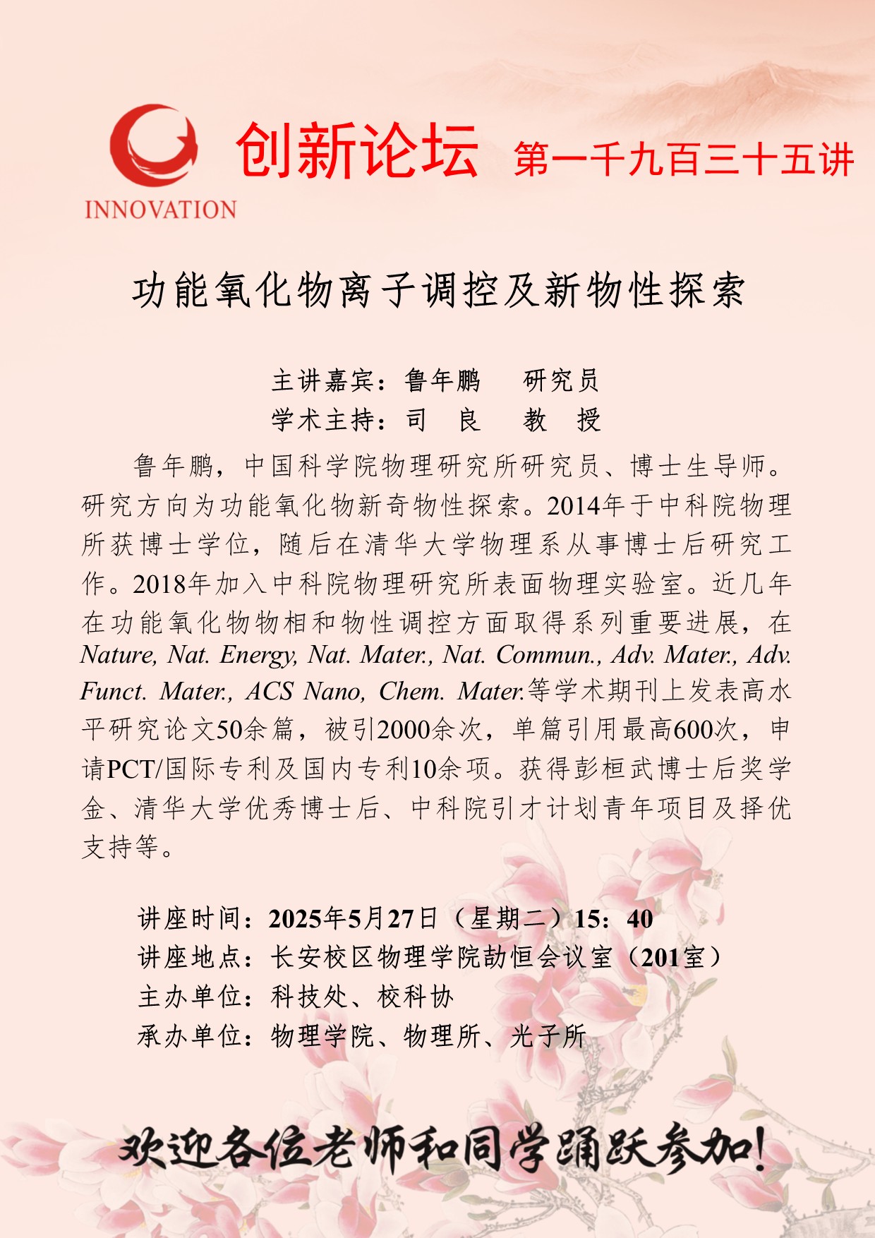 鲁年鹏 研究员 必赢3003no1线路检测中心创新论坛第一千九百三十五讲:功能氧化物离子调控及新物性探索 讲座时间 2025年5月27日(星期二)15:40 讲座地点 长安校区物理学院劼恒会议室(201室) 讲座人介绍 鲁年鹏 研究员 讲座内容