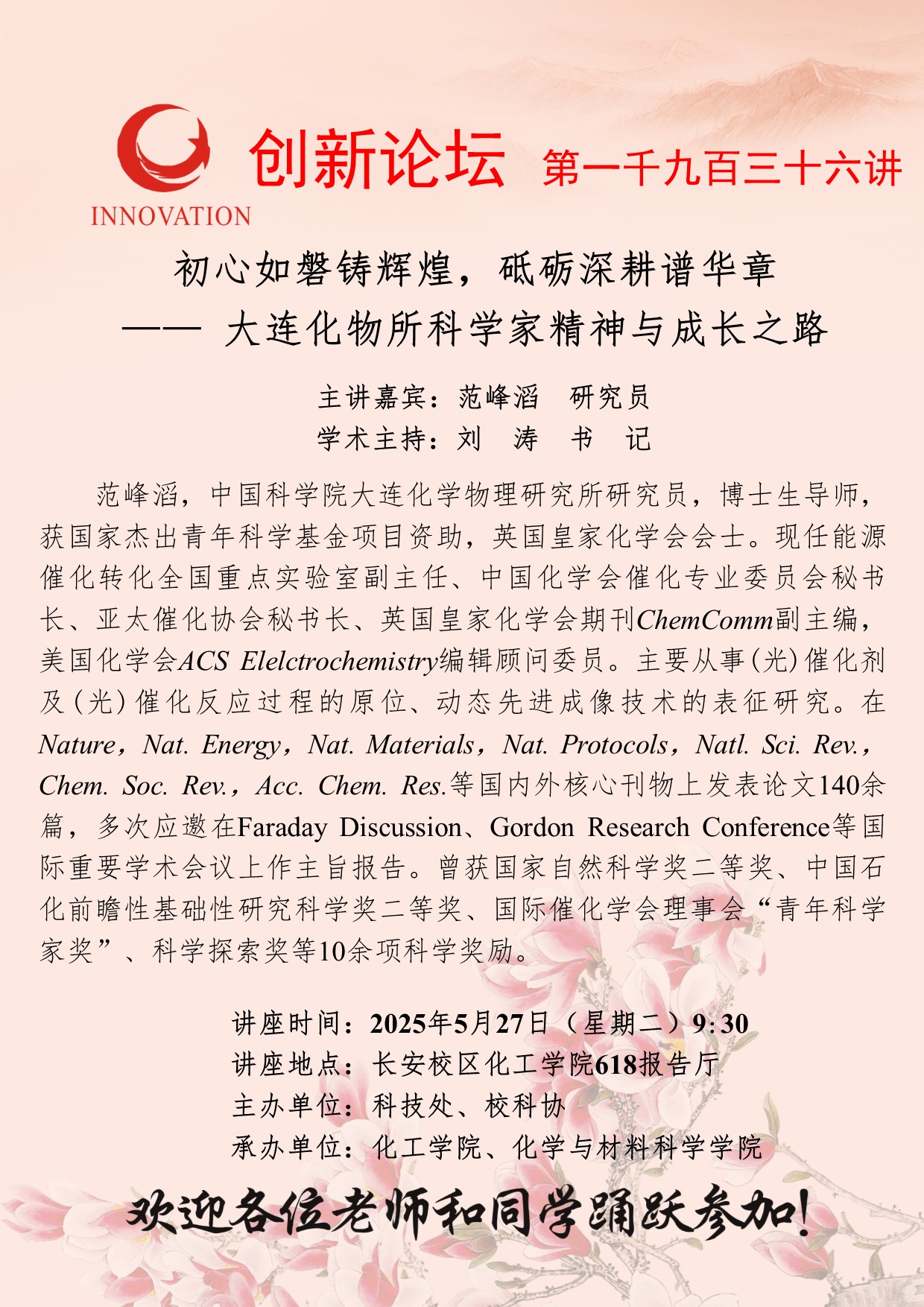 范峰滔 研究员 必赢3003no1线路检测中心创新论坛第一千九百三十六讲:初心如磐铸辉煌,砥砺深耕谱华章——大连化物所科学家精神与成长之路 讲座时间 2025年5月27日(星期二)9:30 讲座地点 长安校区化工学院618报告厅 讲座人介绍 范峰滔 研究员 讲座内容