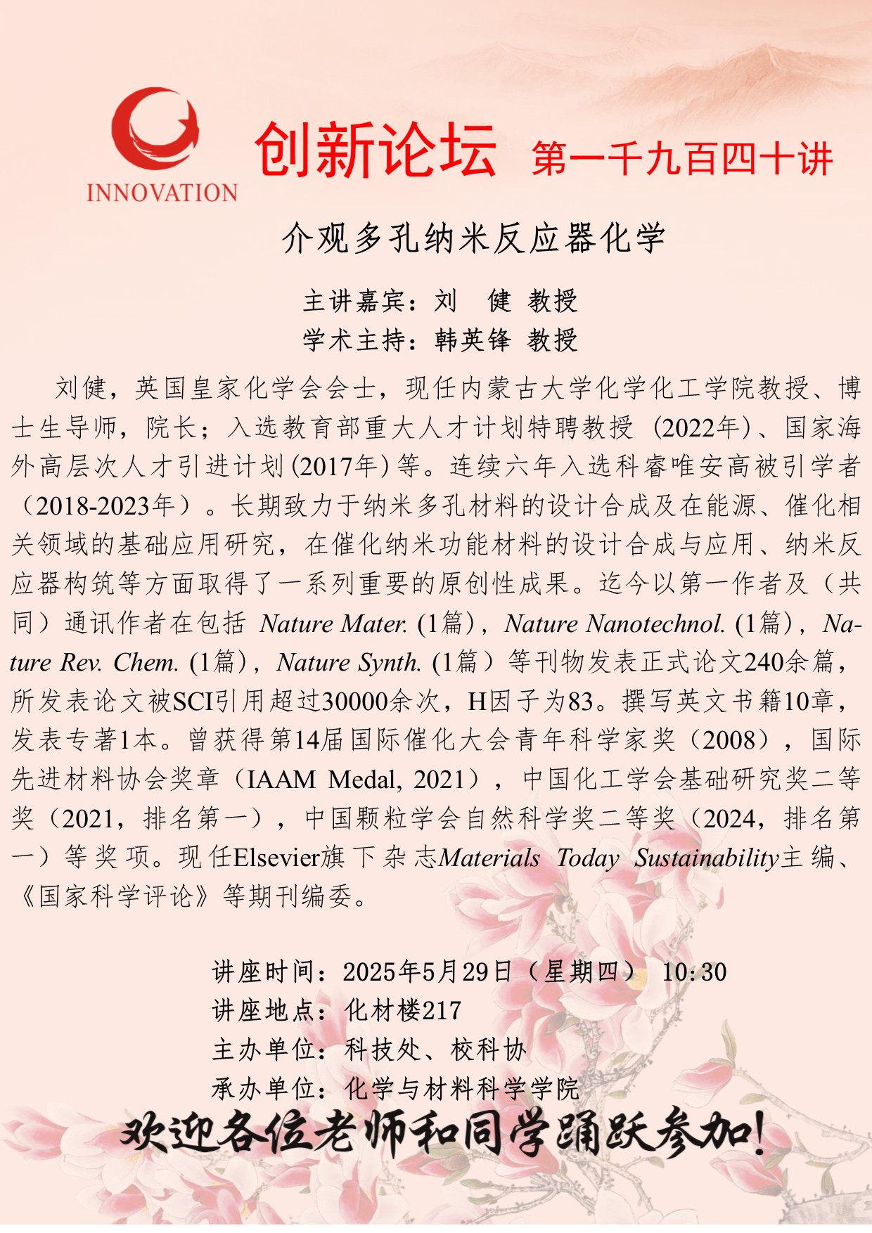 刘健 教授 必赢3003no1线路检测中心创新论坛第一千九百四十讲:介观多孔纳米反应器化学 讲座时间 2025年5月29日(星期四) 10:30 讲座地点 化材楼217 讲座人介绍 刘健 教授 讲座内容