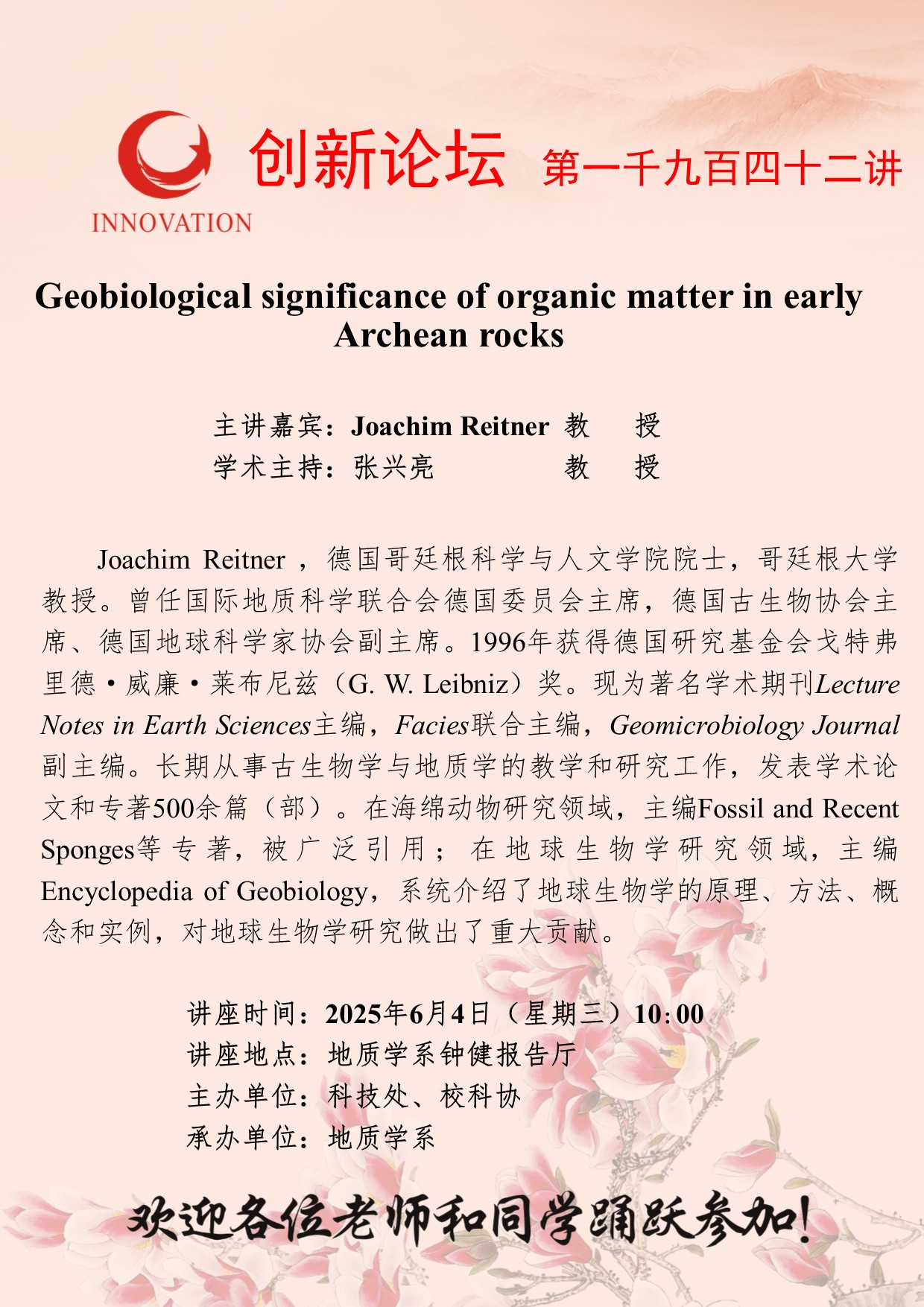 Joachim Reitner 教授 必赢3003no1线路检测中心创新论坛第一千九百四十二讲:Geobiological significance of organic matter in early Archean rocks 讲座时间 2025年6月4日(星期三)10:00 讲座地点 地质学系钟健报告厅 讲座人介绍 Joachim Reitner 教授 讲座内容