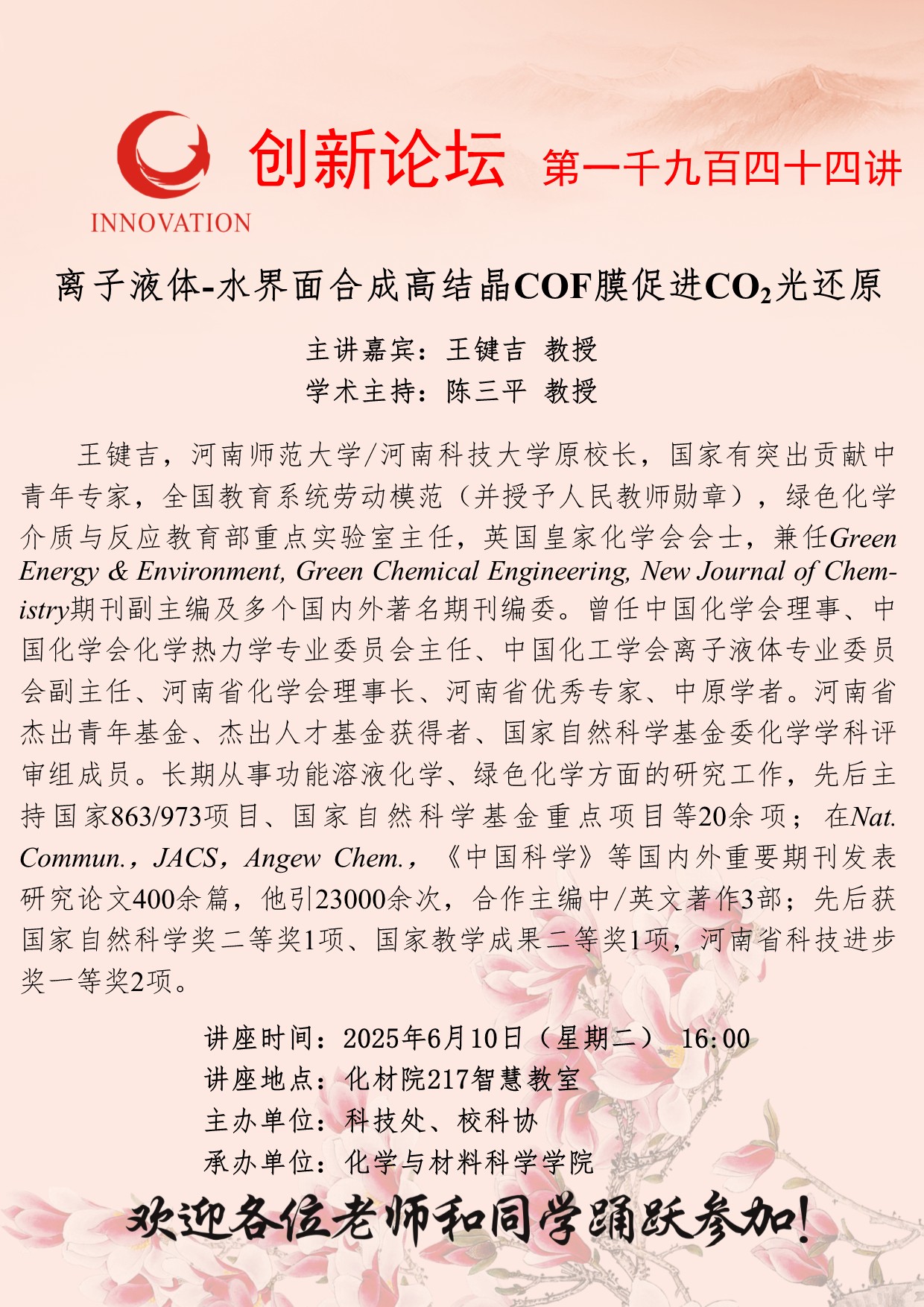 王键吉 教授 必赢3003no1线路检测中心创新论坛第一千九百四十四讲:离子液体-水界面合成高结晶COF膜促进CO2光还原 讲座时间 2025年6月10日(星期二) 16:00 讲座地点 化材院217智慧教室 讲座人介绍 王键吉 教授 讲座内容