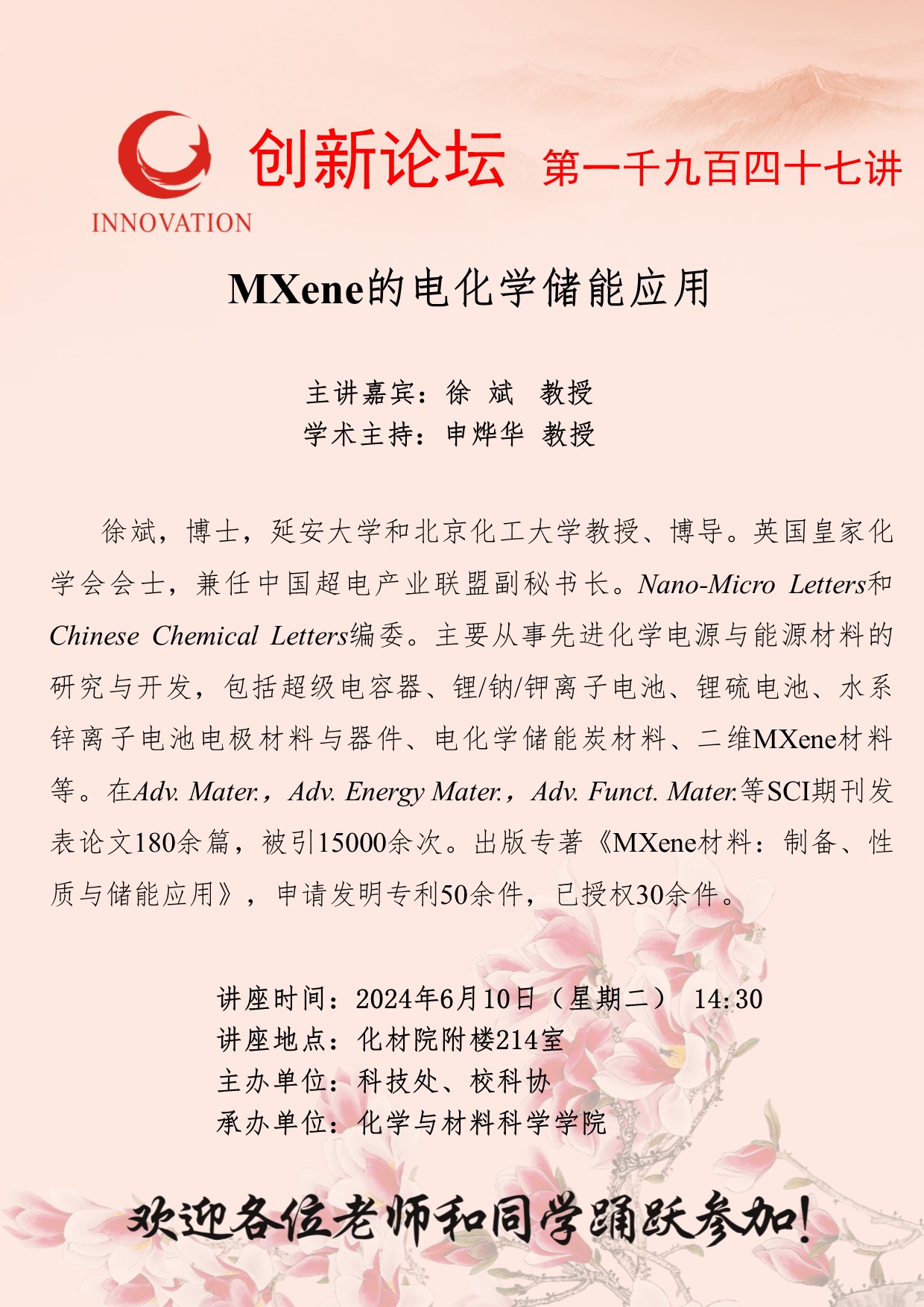 徐斌 教授 必赢3003no1线路检测中心创新论坛第一千九百四十七讲:MXene的电化学储能应用 讲座时间 2024年6月10日(星期二) 14:30 讲座地点 化材院附楼214室 讲座人介绍 徐斌 教授 讲座内容
