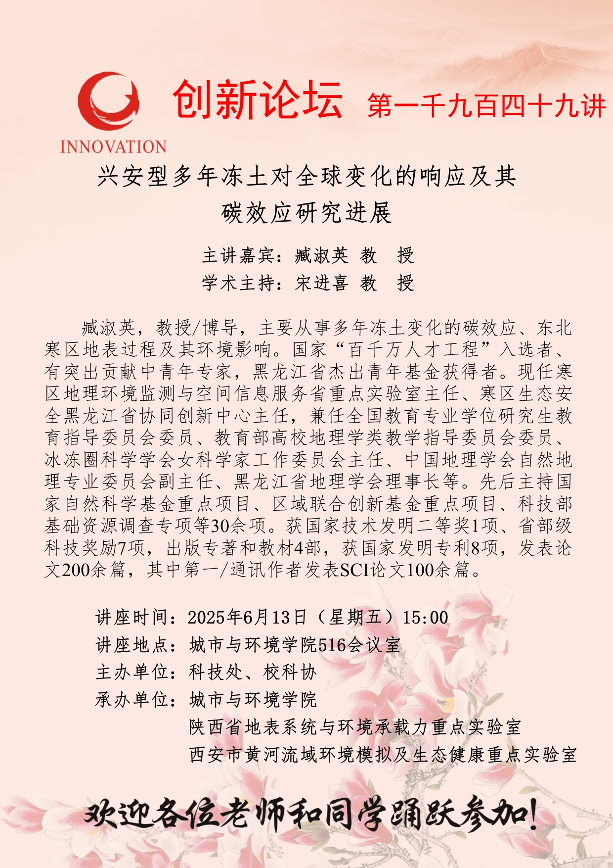 臧淑英 教授 必赢3003no1线路检测中心创新论坛第一千九百四十九讲:兴安型多年冻土对全球变化的响应及其碳效应研究进展 讲座时间 2025年6月13日(星期五)15:00 讲座地点 城市与环境学院516会议室 讲座人介绍 臧淑英 教授 讲座内容