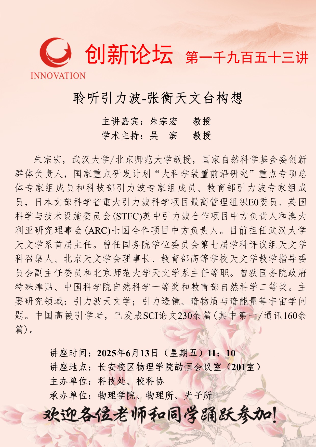朱宗宏 教授 必赢3003no1线路检测中心创新论坛第一千九百五十三讲:聆听引力波-张衡天文台构想 讲座时间 2025年6月13日(星期五)11:10 讲座地点 长安校区物理学院劼恒会议室(201室) 讲座人介绍 朱宗宏 教授 讲座内容