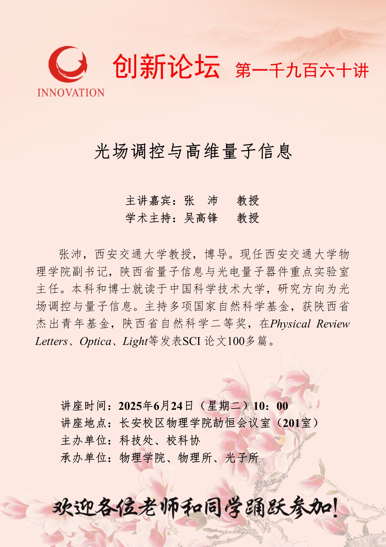 张沛 教授 必赢3003no1线路检测中心创新论坛第一千九百六十讲:光场调控与高维量子信息 讲座时间 2025年6月24日(星期二)10:00 讲座地点 长安校区物理学院劼恒会议室(201室) 讲座人介绍 张沛 教授 讲座内容