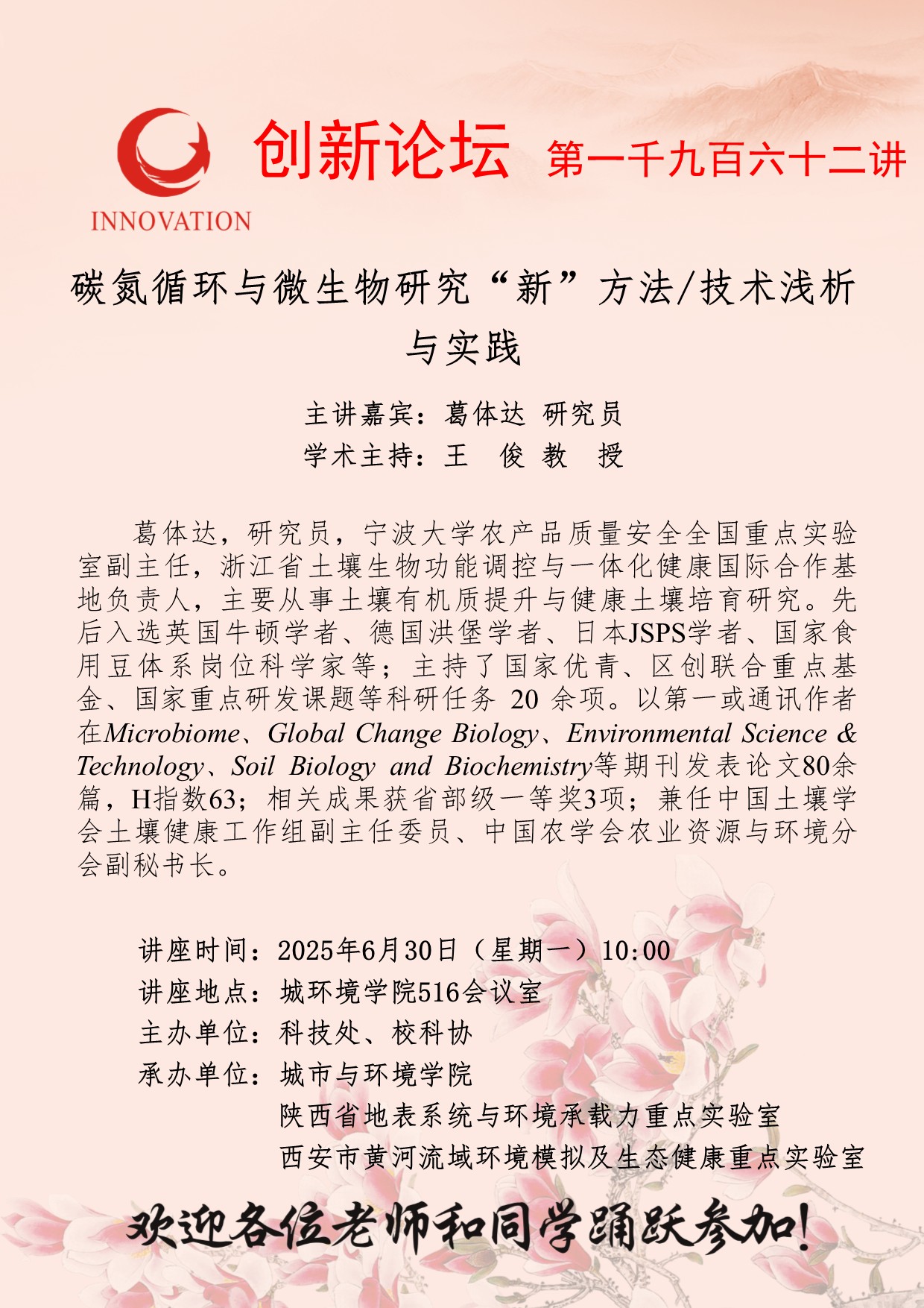 葛体达 研究员 必赢3003no1线路检测中心创新论坛第一千九百六十二讲:碳氮循环与微生物研究“新”方法/技术浅析与实践 讲座时间 2025年6月30日(星期一)10:00 讲座地点 城环境学院516会议室 讲座人介绍 葛体达 研究员 讲座内容