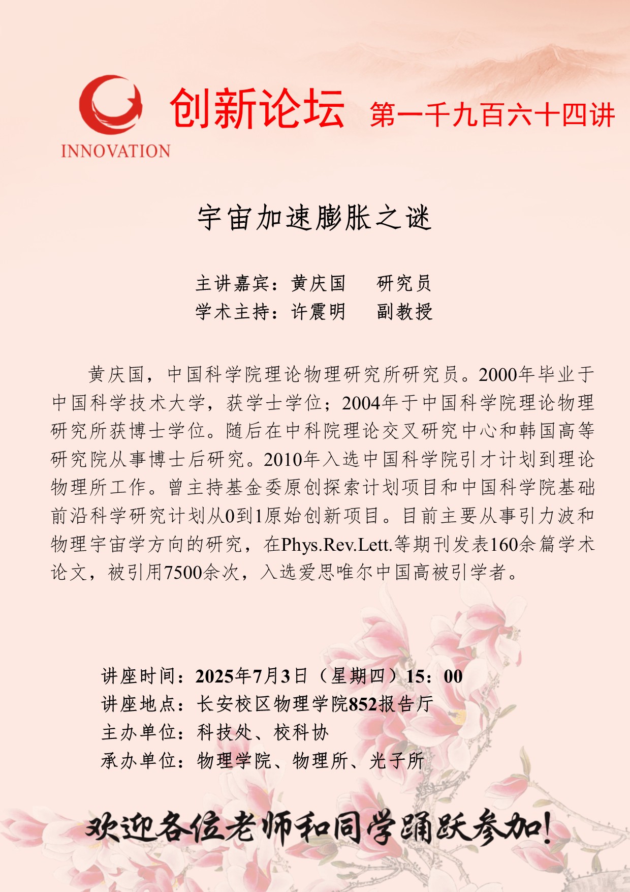 黄庆国 研究员 必赢3003no1线路检测中心创新论坛第一千九百六十四讲:宇宙加速膨胀之谜 讲座时间 2025年7月3日(星期四)15:00 讲座地点 长安校区物理学院852报告厅 讲座人介绍 黄庆国 研究员 讲座内容