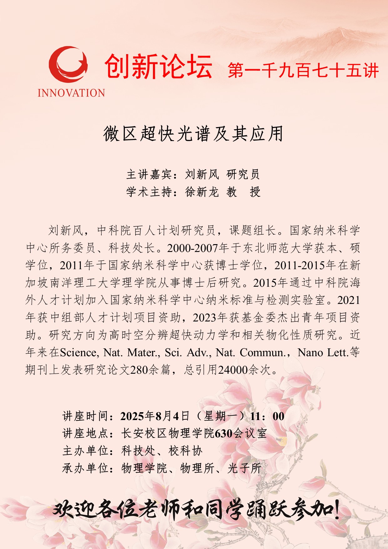 刘新风 研究员 必赢3003no1线路检测中心创新论坛第一千九百七十五讲:微区超快光谱及其应用 讲座时间 2025年8月4日(星期一) 讲座地点 长安校区物理学院630会议室 讲座人介绍 刘新风 研究员 讲座内容