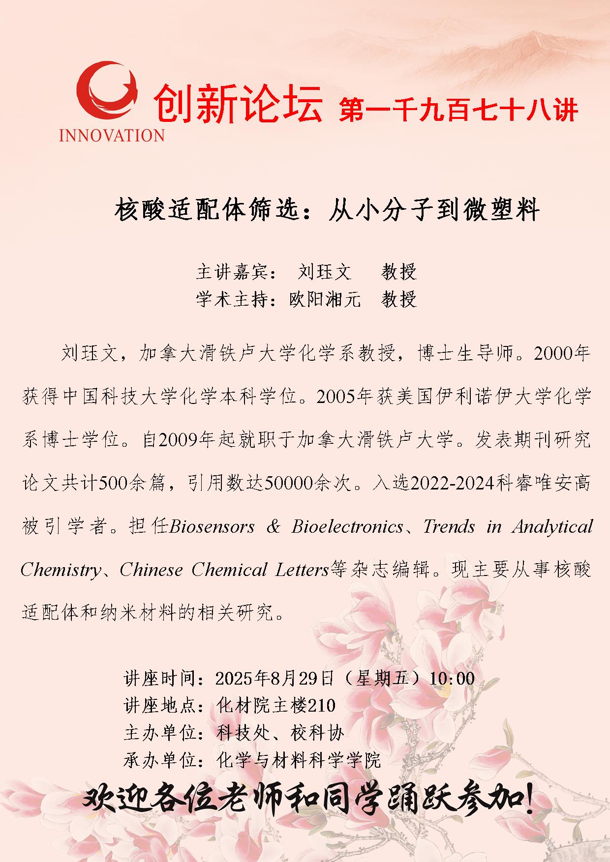 刘珏文 教授 必赢3003no1线路检测中心创新论坛第一千九百七十八讲:核酸适配体筛选:从小分子到微塑料 讲座时间 2025年8月29日(星期五)10:00 讲座地点 化材院主楼210 讲座人介绍 刘珏文 教授 讲座内容