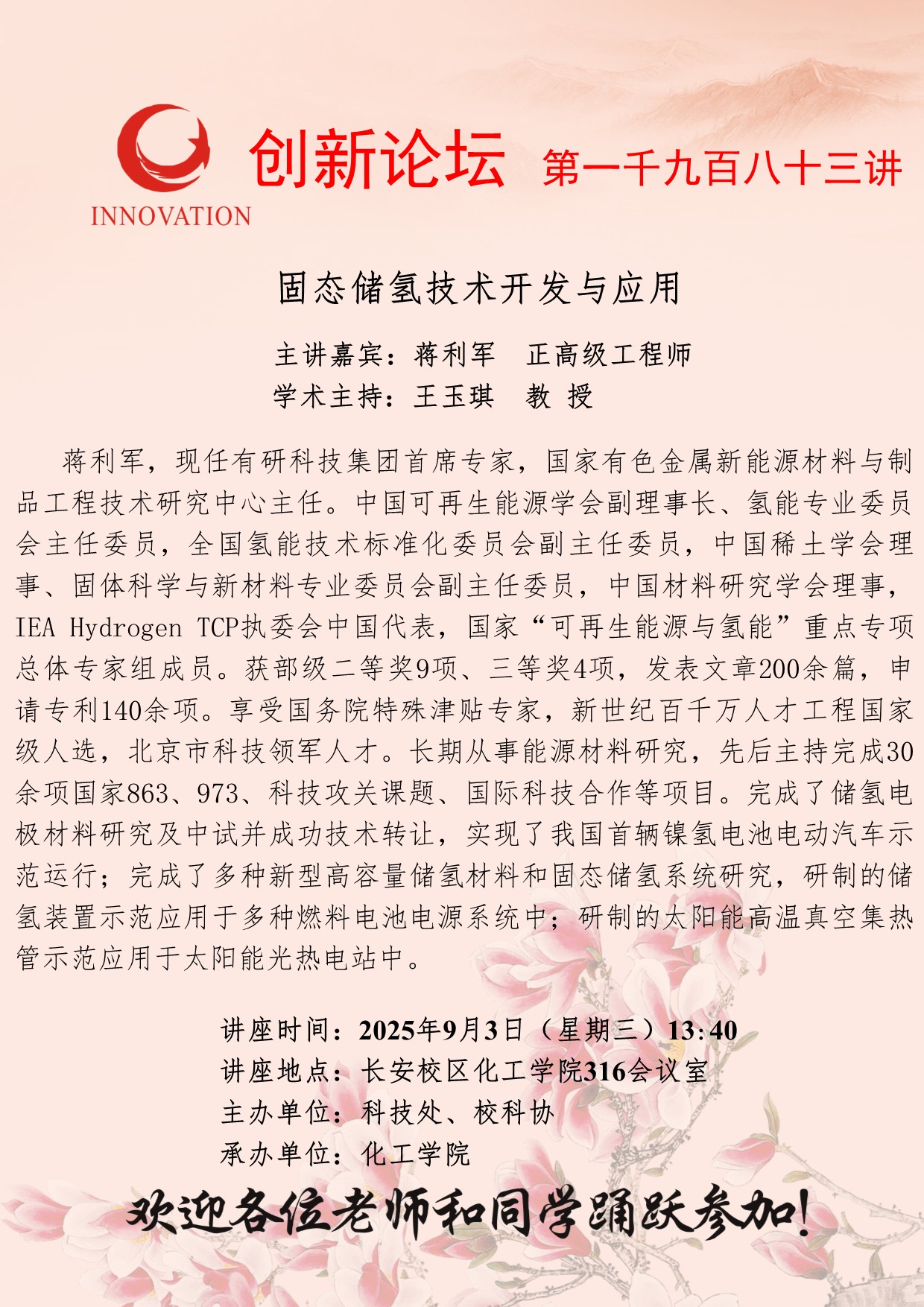 蒋利军 正高级工程师 必赢3003no1线路检测中心创新论坛第一千九百八十三讲:固态储氢技术开发与应用 讲座时间 2025年9月3日(星期三)13:40 讲座地点 长安校区化工学院316会议室 讲座人介绍 蒋利军 正高级工程师 讲座内容