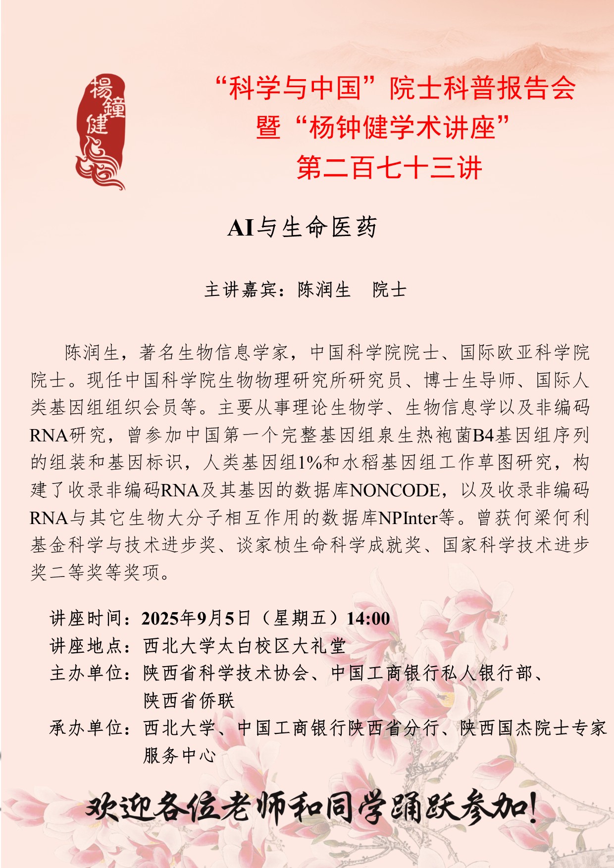 陈润生 院士 “科学与中国”院士科普报告会暨“杨钟健学术讲座”第二百七十三讲:AI与生命医药 讲座时间 2025年9月5日(星期五)14:00 讲座地点 必赢3003no1线路检测中心太白校区大礼堂 讲座人介绍 陈润生 院士 讲座内容
