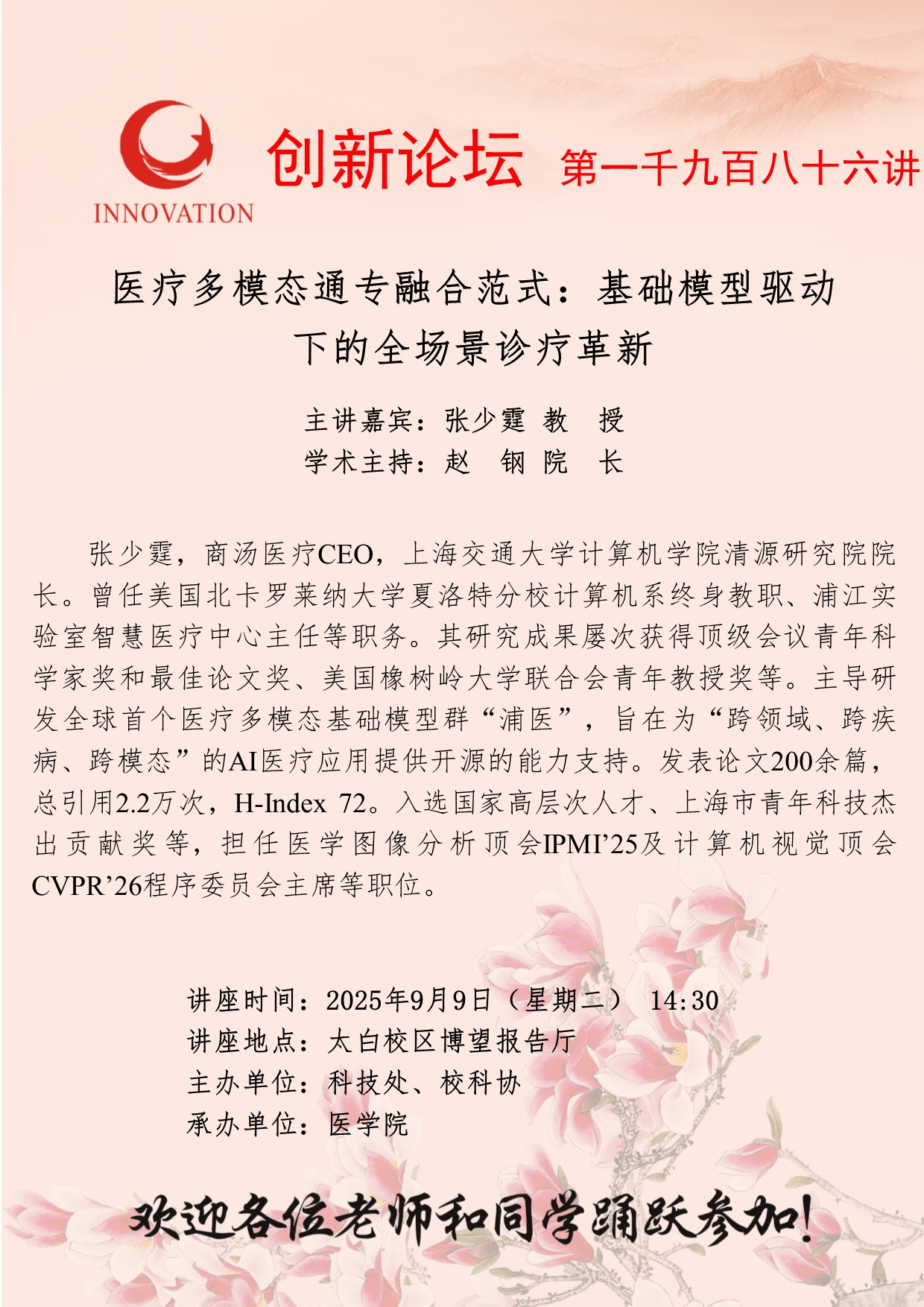 张少霆 教 授 必赢3003no1线路检测中心创新论坛第一千九百八十六讲:医疗多模态通专融合范式:基础模型驱动下的全场景诊疗革新 讲座时间 2025年9月9日(星期二) 14:30 讲座地点 太白校区博望报告厅 讲座人介绍 张少霆 教 授 讲座内容 fu
