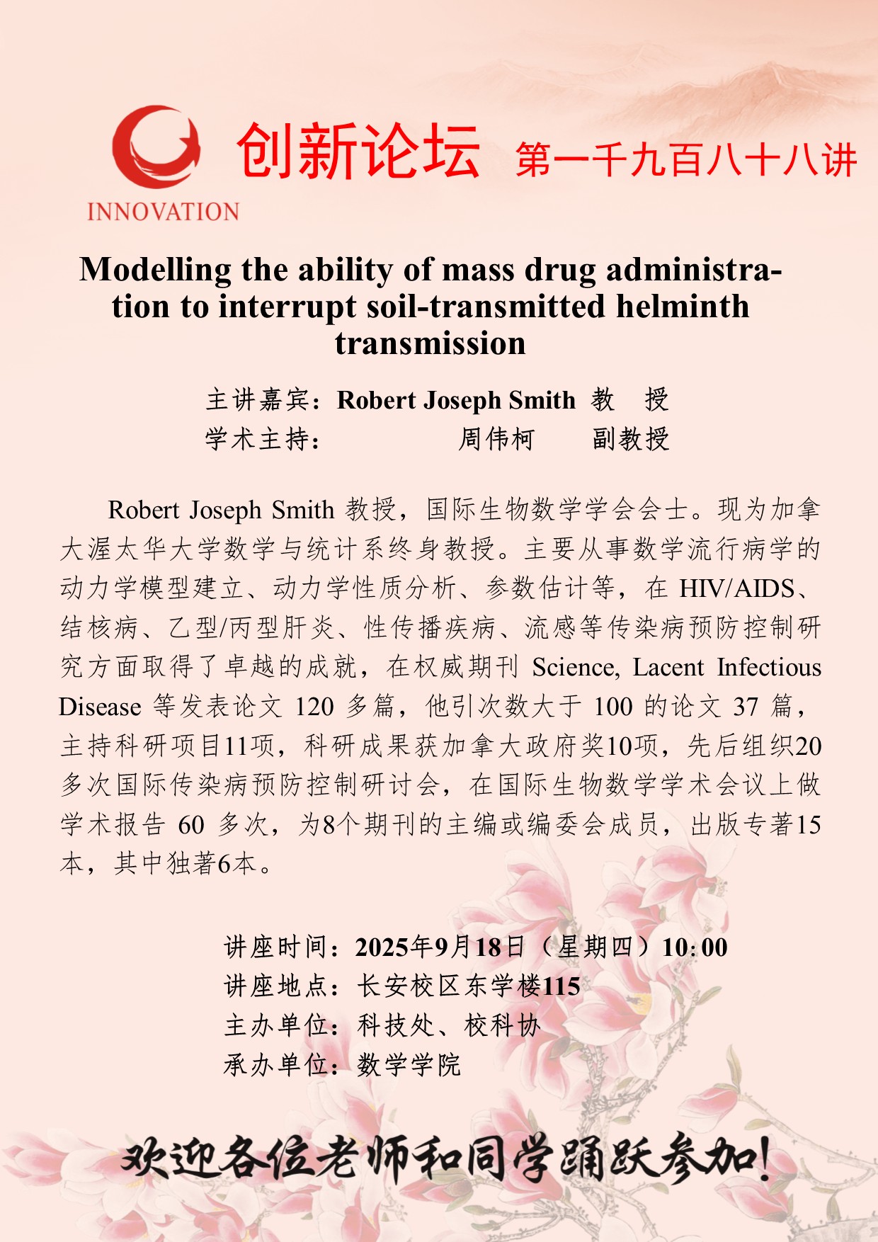 Robert Joseph Smith 教授 必赢3003no1线路检测中心创新论坛第一千九百八十八讲:Modelling the ability of mass drug administration to interrupt soil-transmitted helminth transmission 讲座时间 2025年9月18日(星期四)10:00 讲座地点 长安校区东学楼115 讲座人介绍 Robert Joseph Smith 教授 讲座内容