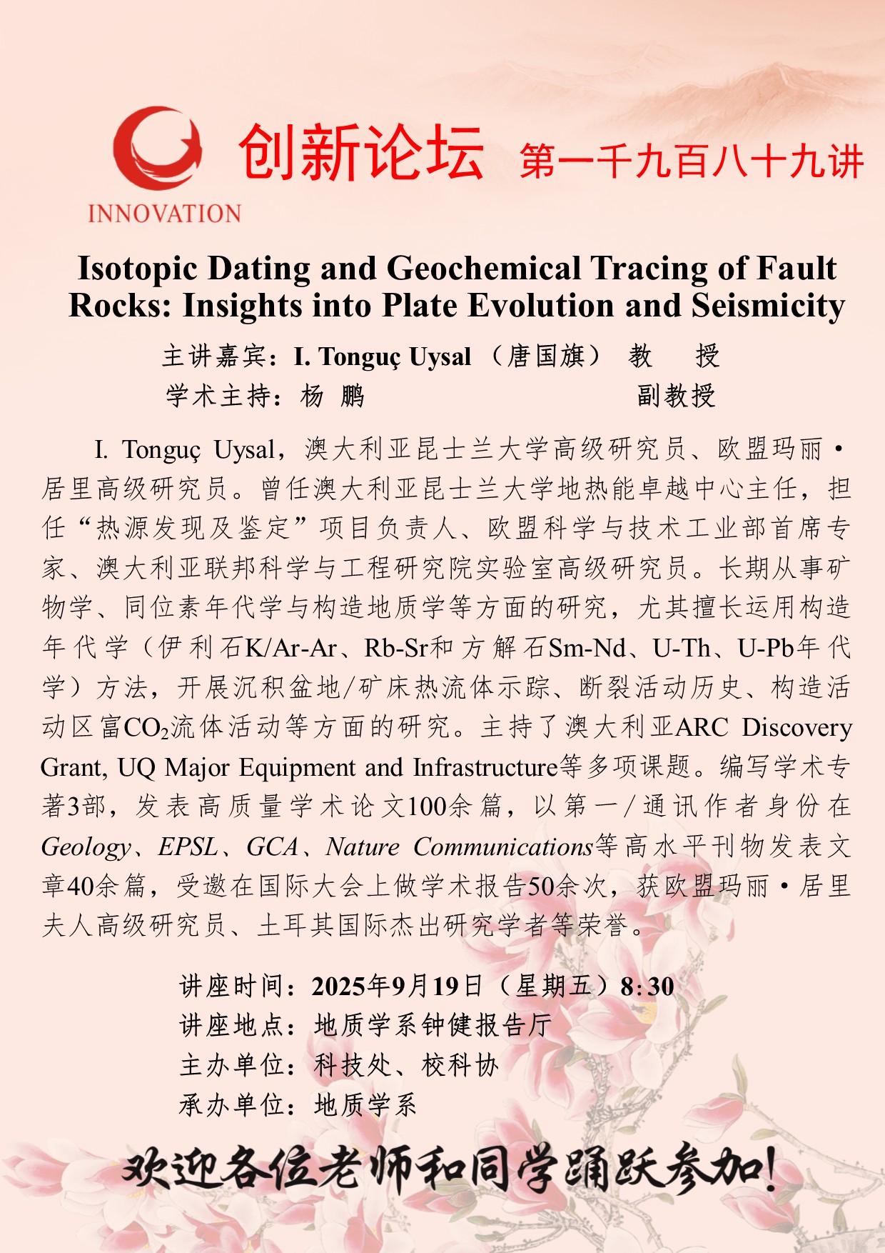 I. Tonguç Uysal 教授 必赢3003no1线路检测中心创新论坛第一千九百八十九讲:Isotopic Dating and Geochemical Tracing of Fault Rocks: Insights into Plate Evolution and Seismicity 讲座时间 2025年9月19日(星期五)8:30 讲座地点 地质学系钟健报告厅 讲座人介绍 I. Tonguç Uysal 教授 讲座内容