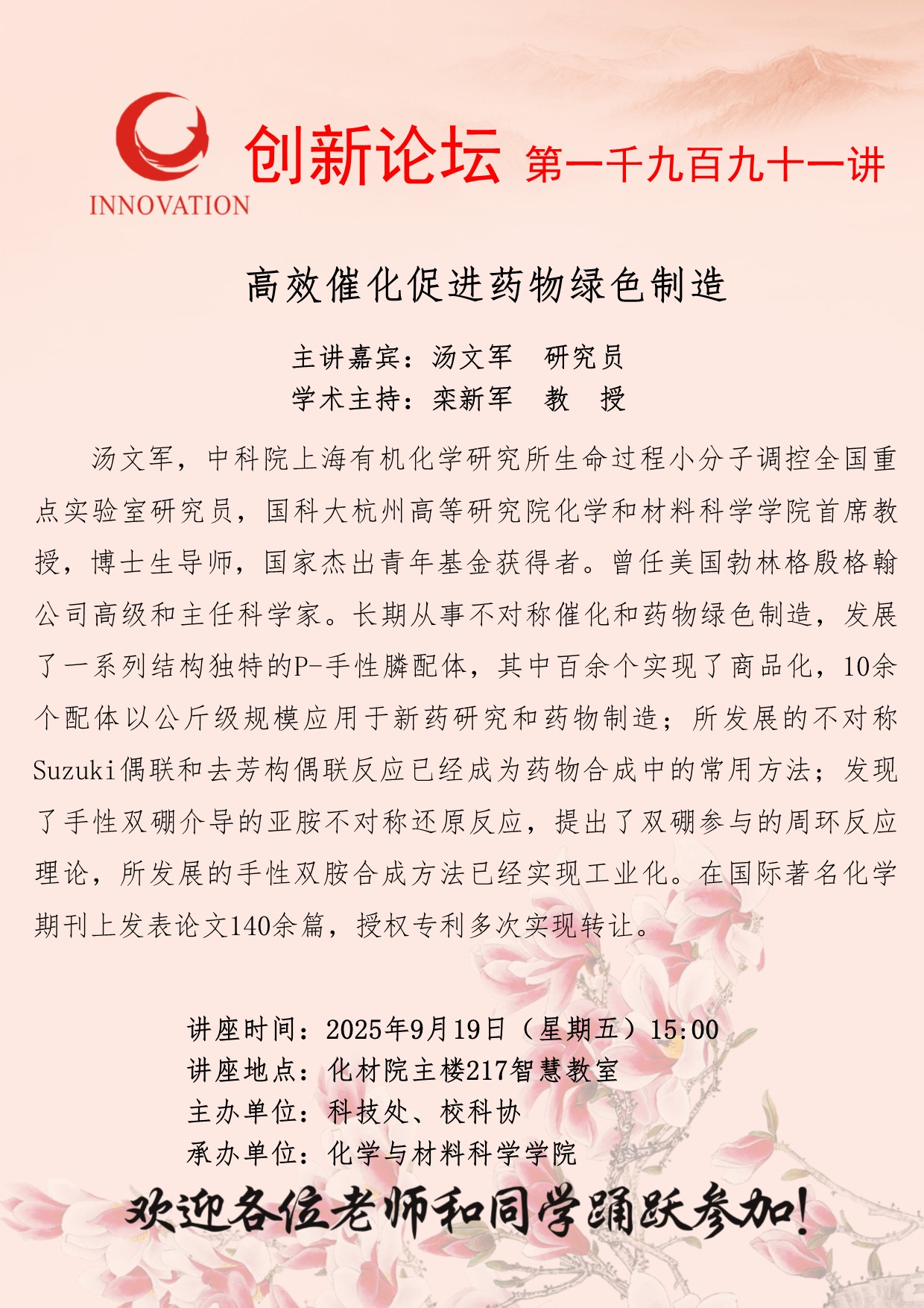 汤文军 研究员 必赢3003no1线路检测中心创新论坛第一千九百九十一讲:高效催化促进药物绿色制造 讲座时间 2025年9月19日(星期五)15:00 讲座地点 化材院主楼217智慧教室 讲座人介绍 汤文军 研究员 讲座内容