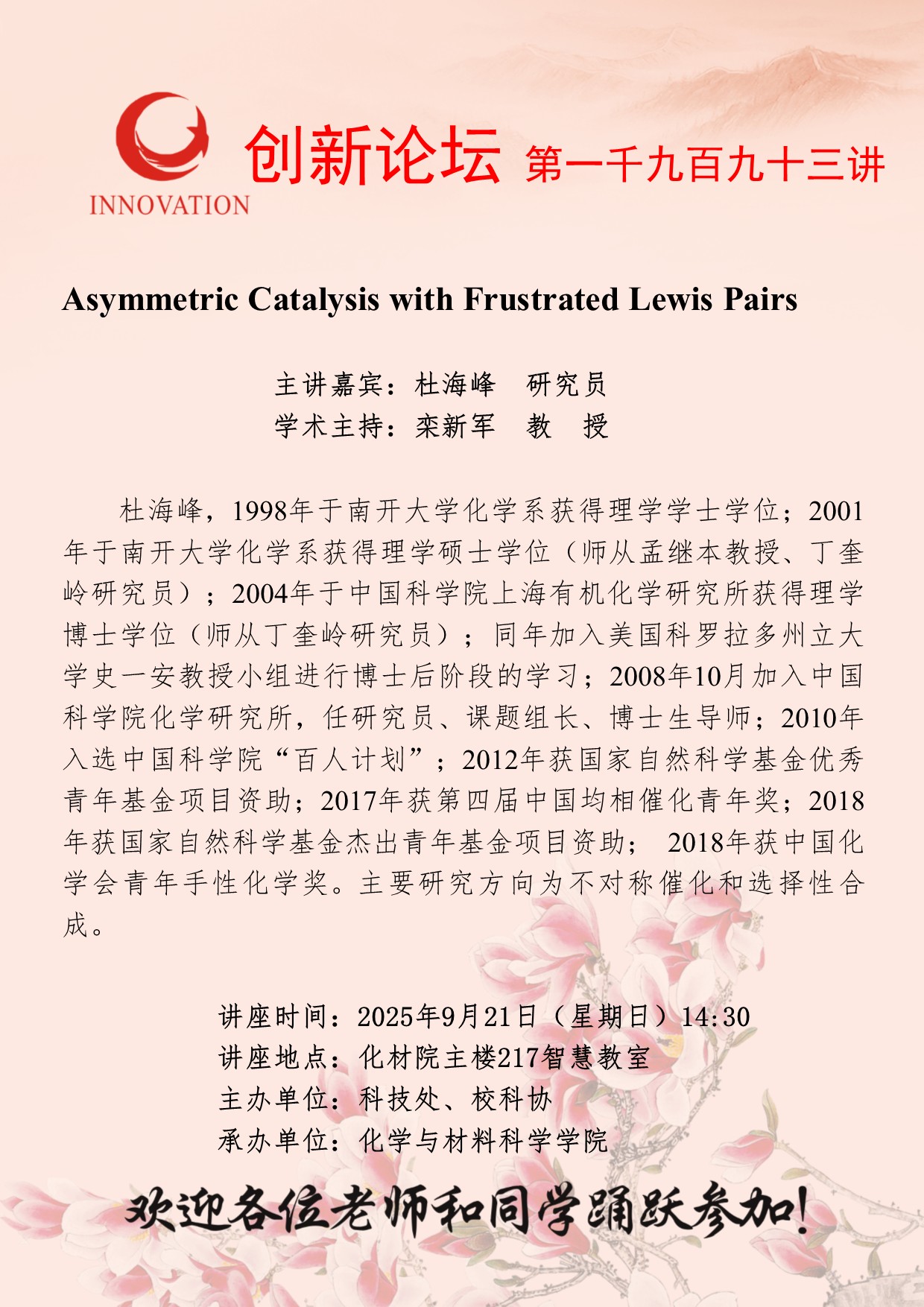 杜海峰 研究员 必赢3003no1线路检测中心创新论坛第一千九百九十三讲:Asymmetric Catalysis with Frustrated Lewis Pairs 讲座时间 2025年9月21日(星期日)14:30 讲座地点 化材院主楼217智慧教室 讲座人介绍 杜海峰 研究员 讲座内容