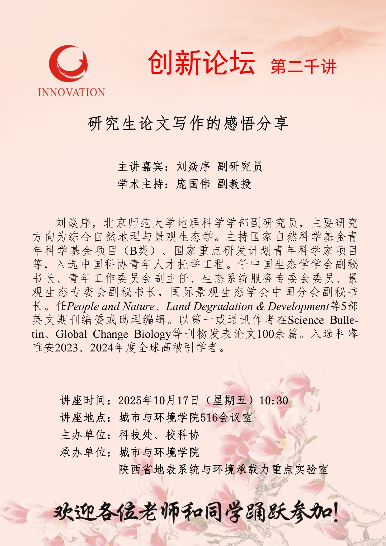 刘焱序 副研究员 必赢3003no1线路检测中心创新论坛第二千讲:研究生论文写作的感悟分享 讲座时间 2025年10月17日(星期五)10:30 讲座地点 城市与环境学院516会议室 讲座人介绍 刘焱序 副研究员 讲座内容