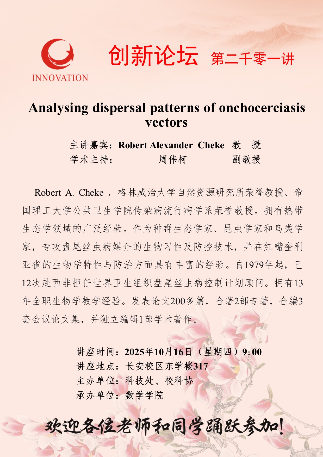 Robert Alexander Cheke 教授 必赢3003no1线路检测中心创新论坛第二千零一讲:Analysing dispersal patterns of onchocerciasis vectors 讲座时间 2025年10月16日(星期四)9:00 讲座地点 长安校区东学楼317 讲座人介绍 Robert Alexander Cheke 教授 讲座内容