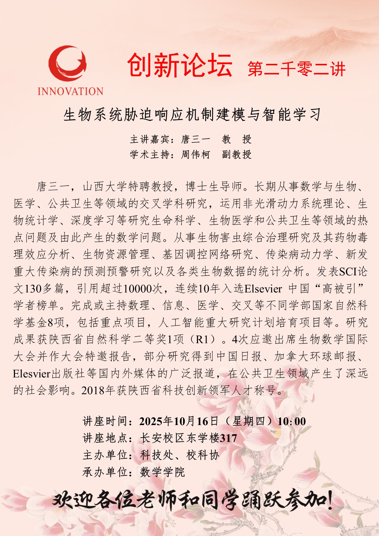 唐三一 教授 必赢3003no1线路检测中心创新论坛第二千零二讲:生物系统胁迫响应机制建模与智能学习 讲座时间 2025年10月16日(星期四)10:00 讲座地点 长安校区东学楼317 讲座人介绍 唐三一 教授 讲座内容