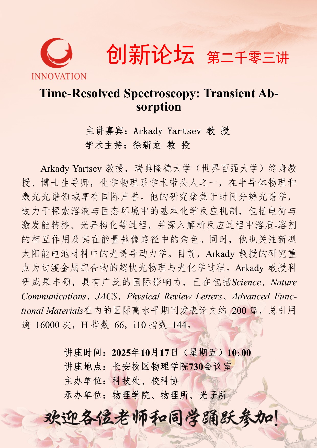 Arkady Yartsev 教授 必赢3003no1线路检测中心创新论坛第二千零三讲:Time-Resolved Spectroscopy: Transient Absorption 讲座时间 2025年10月17日(星期五)10:00 讲座地点 长安校区物理学院730会议室 讲座人介绍 Arkady Yartsev 教授 讲座内容