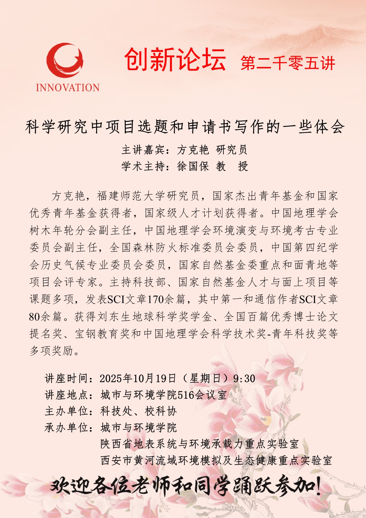 方克艳 研究员 必赢3003no1线路检测中心创新论坛第二千零五讲:科学研究中项目选题和申请书写作的一些体会 讲座时间 2025年10月19日(星期日)9:30 讲座地点 城市与环境学院516会议室 讲座人介绍 方克艳 研究员 讲座内容