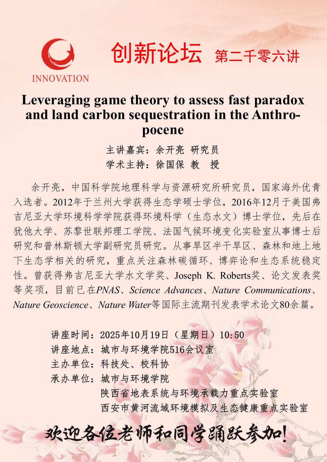 余开亮 研究员 必赢3003no1线路检测中心创新论坛第二千零六讲:Leveraging game theory to assess fast paradoxand land carbon sequestration in the Anthro-pocene 讲座时间 2025年10月19日(星期日)10:50 讲座地点 城市与环境学院516会议室 讲座人介绍 余开亮 研究员 讲座内容