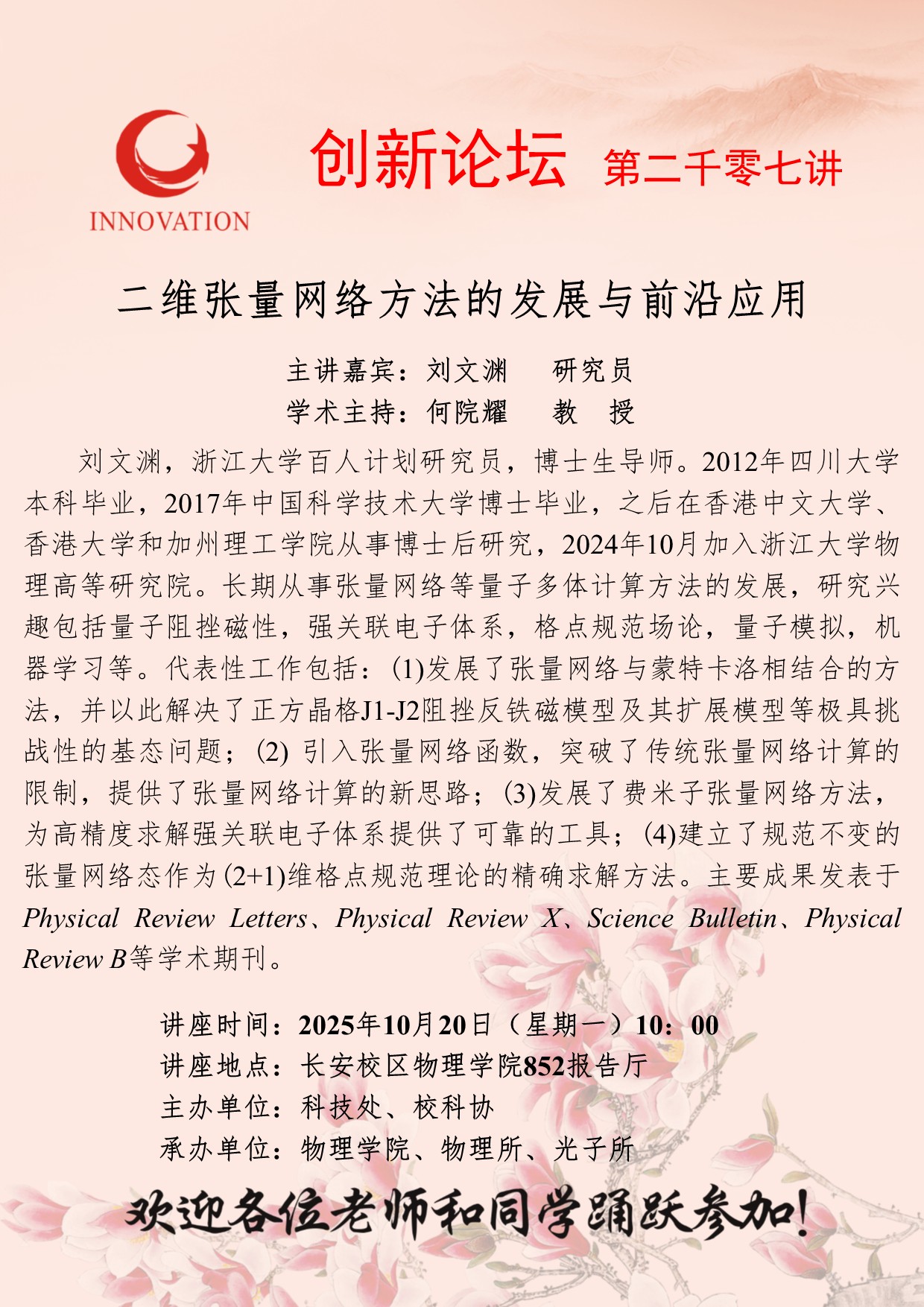 刘文渊 研究员 必赢3003no1线路检测中心创新论坛第二千零七讲:二维张量网络方法的发展与前沿应用 讲座时间 2025年10月20日(星期一)10:00 讲座地点 长安校区物理学院852报告厅 讲座人介绍 刘文渊 研究员 讲座内容
