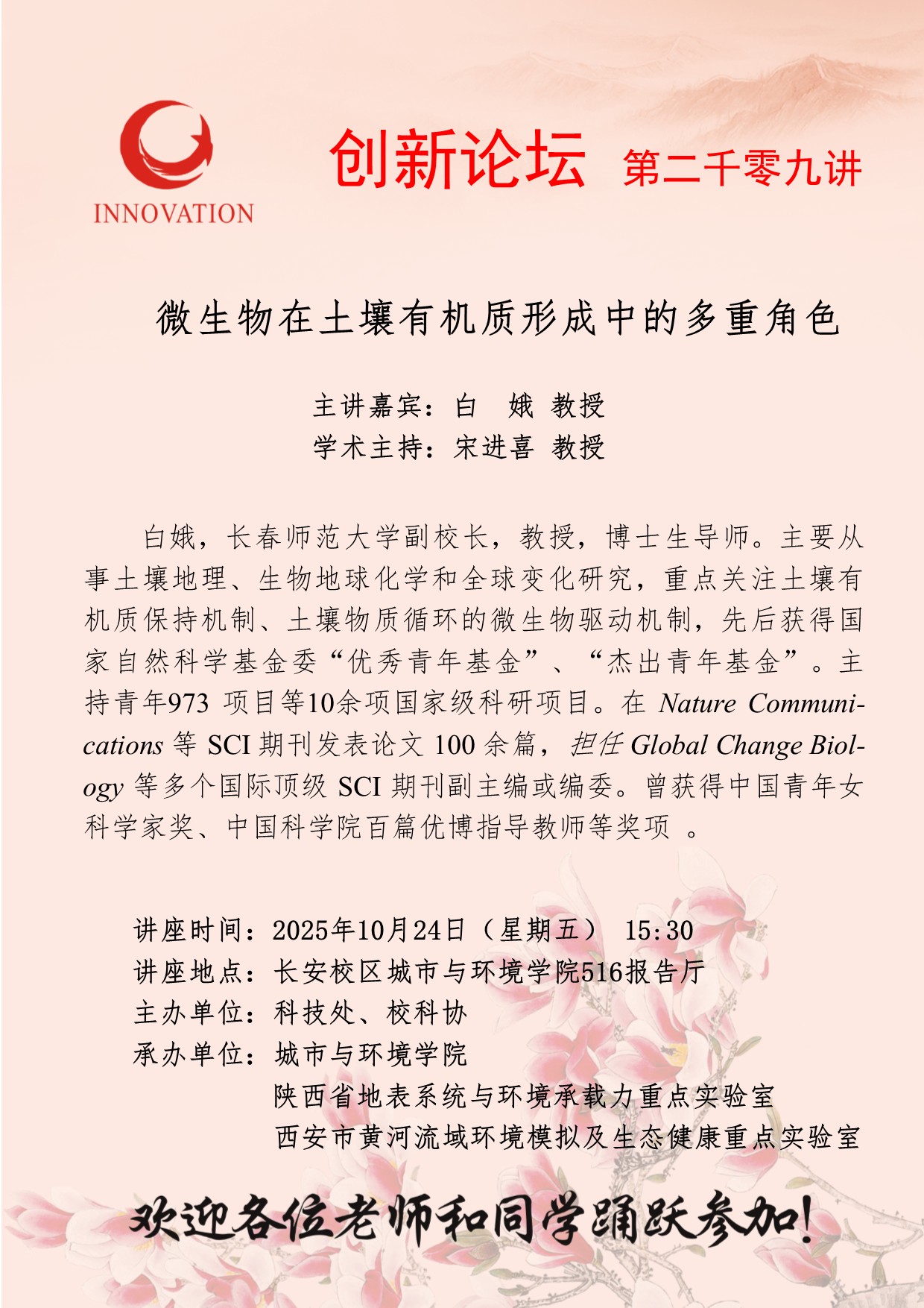 白娥 教授 必赢3003no1线路检测中心创新论坛第二千零九讲:微生物在土壤有机质形成中的多重角色 讲座时间 2025年10月24日(星期五) 15:30 讲座地点 长安校区城市与环境学院516报告厅 讲座人介绍 白娥 教授 讲座内容