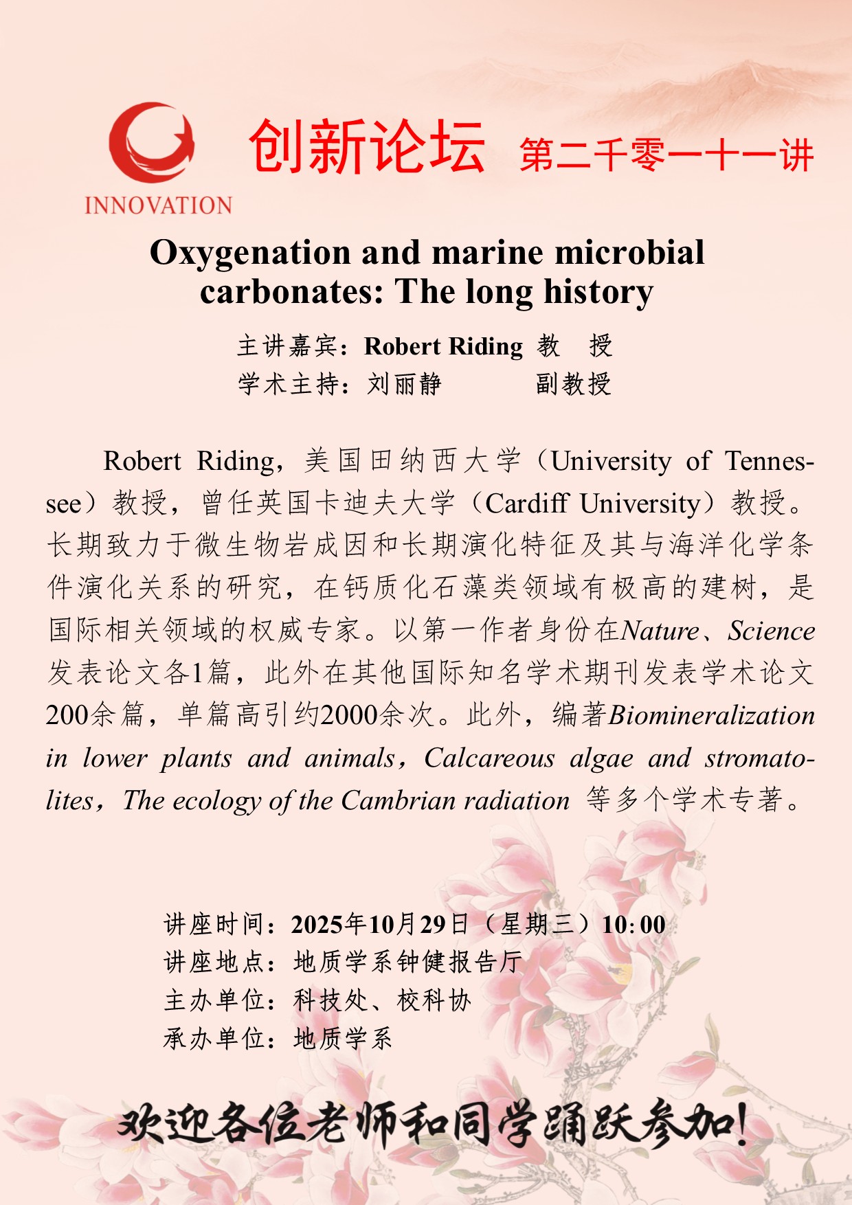 Robert Riding 教授 必赢3003no1线路检测中心创新论坛第二千零一十一讲:Oxygenation and marine microbial carbonates: The long history 讲座时间 2025年10月29日(星期三)10:00 讲座地点 地质学系钟健报告厅 讲座人介绍 Robert Riding 教授 讲座内容