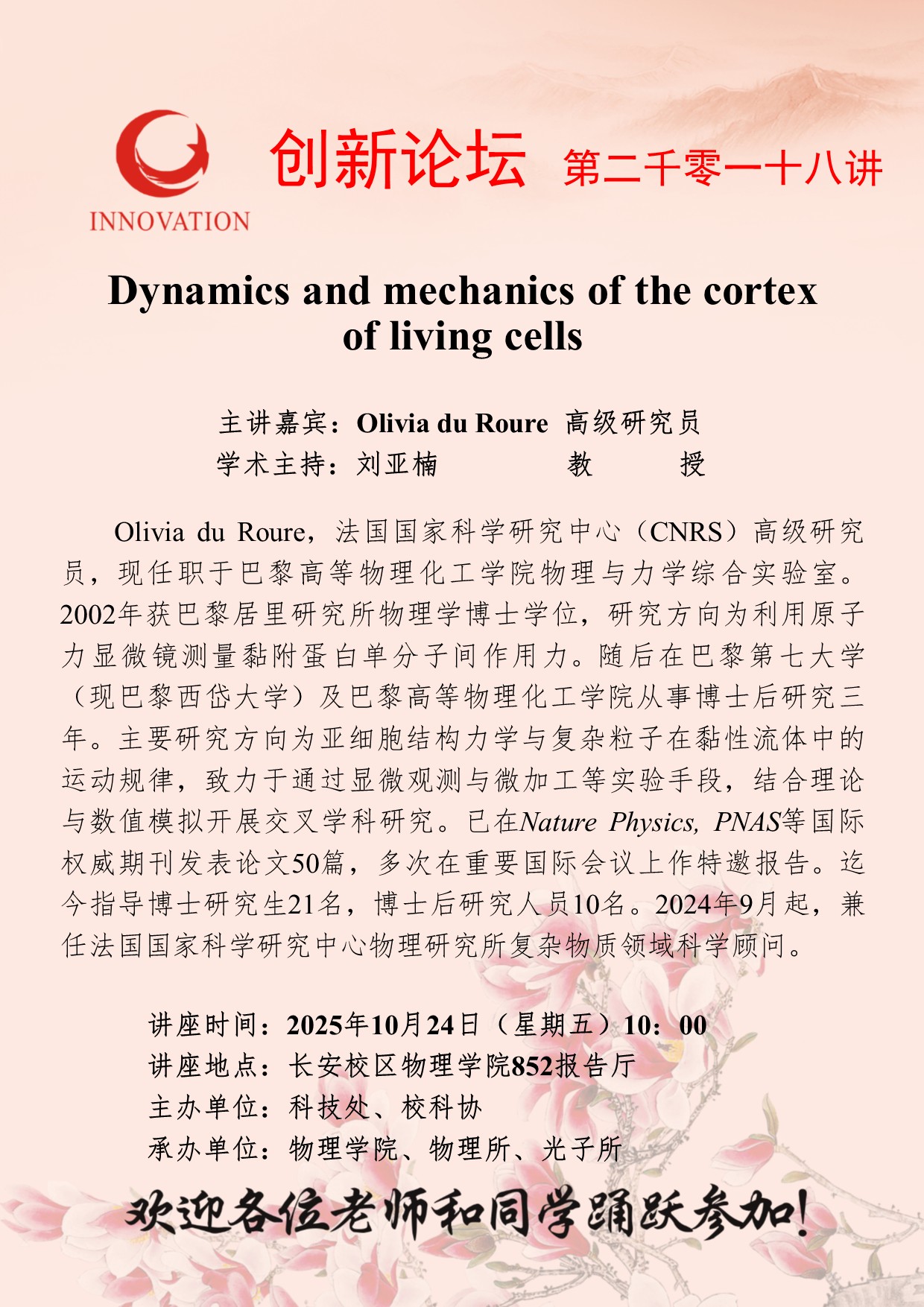 Olivia du Roure 高级研究员 必赢3003no1线路检测中心创新论坛第二千零一十八讲:Dynamics and mechanics of the cortex of living cells 讲座时间 2025年10月24日(星期五)10:00 讲座地点 长安校区物理学院852报告厅 讲座人介绍 Olivia du Roure 高级研究员 讲座内容