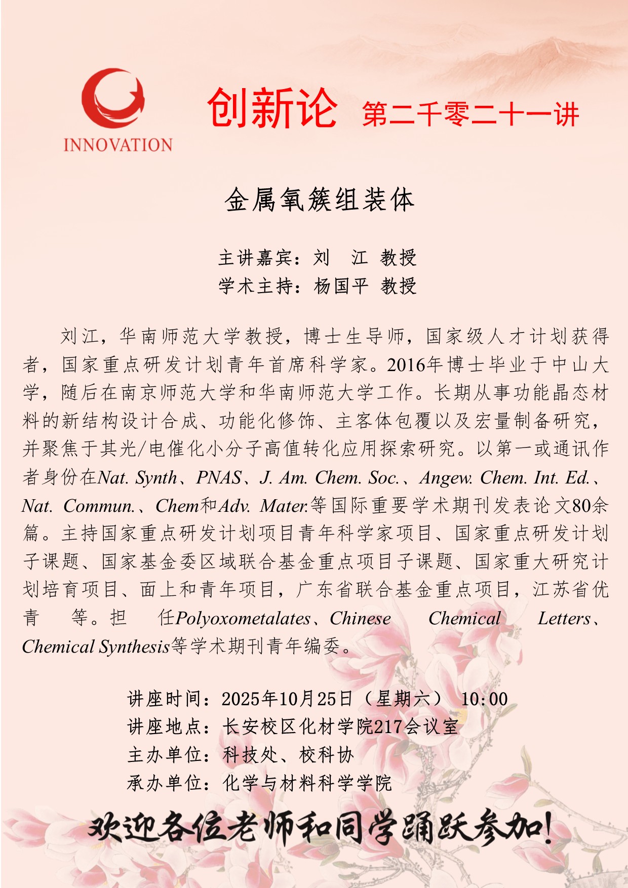 刘 江 教授 必赢3003no1线路检测中心创新论坛第二千零二十一讲:金属氧簇组装体 讲座时间 2025年10月25日(星期六) 10:00 讲座地点 长安校区化材学院217会议室 讲座人介绍 刘 江 教授 讲座内容