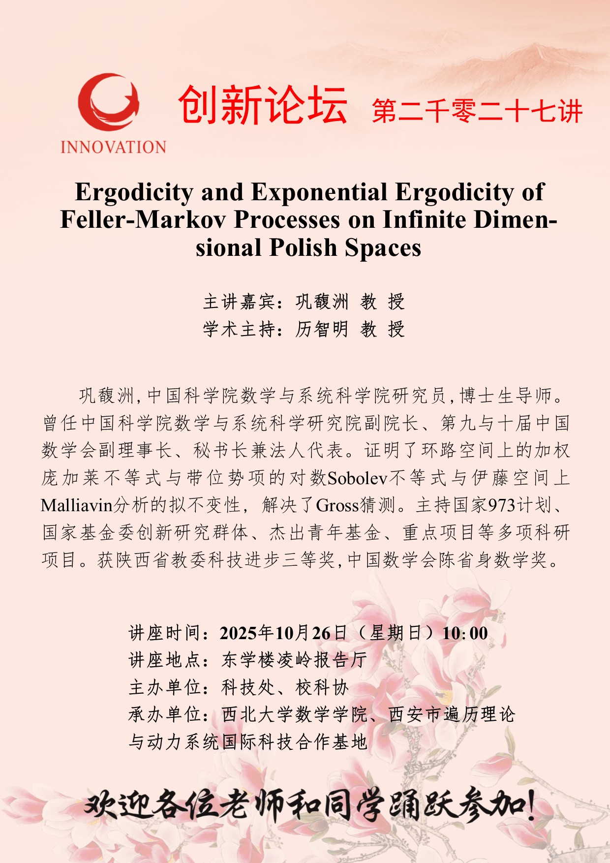 巩馥洲 教 授 必赢3003no1线路检测中心创新论坛第二千零二十七讲:Ergodicity and Exponential Ergodicity of Feller-Markov Processes on Infinite Dimensional Polish Spaces 讲座时间 2025年10月26日(星期日)10:00 讲座地点 东学楼凌岭报告厅 讲座人介绍 巩馥洲 教 授 讲座内容