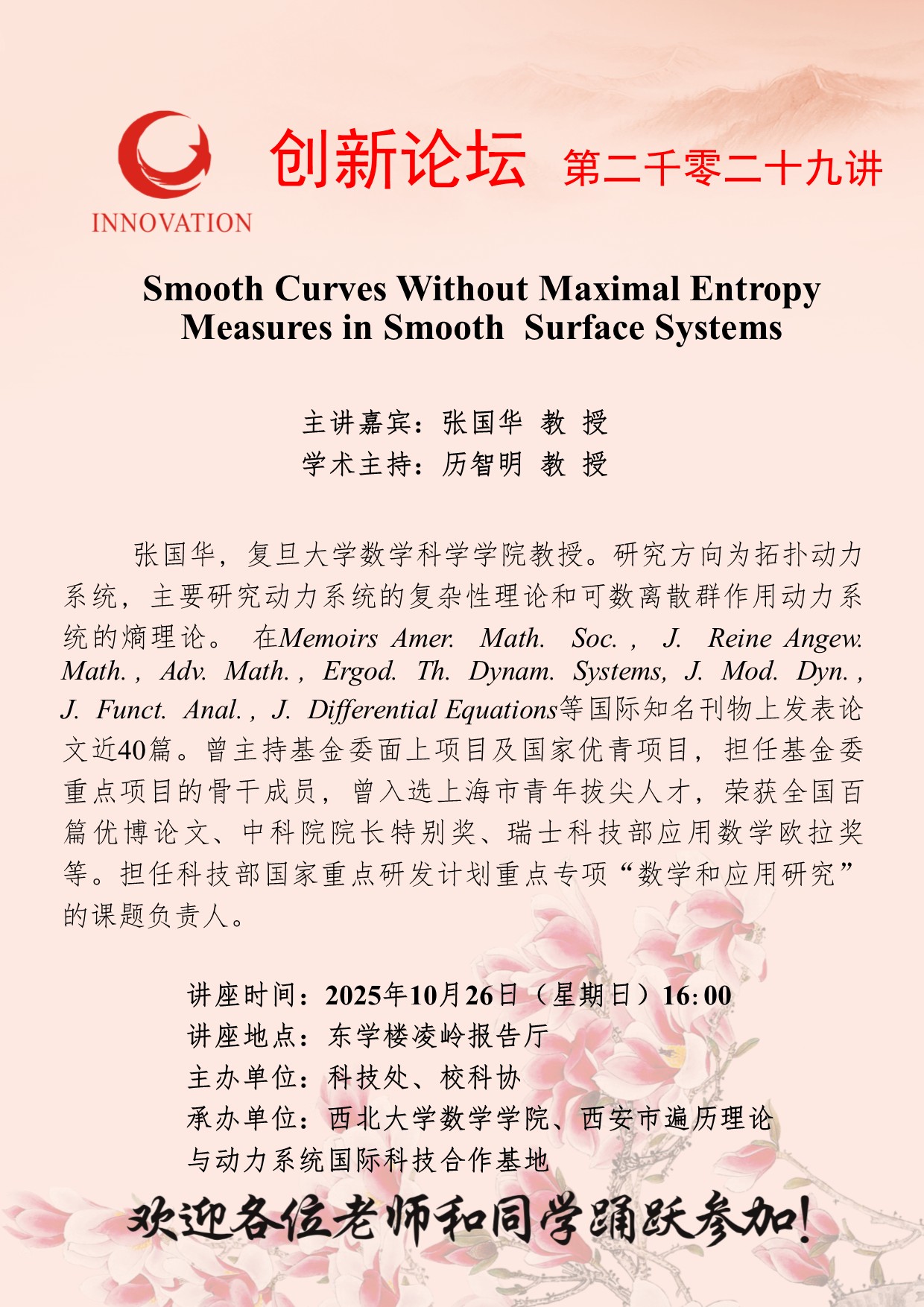 张国华 教 授 必赢3003no1线路检测中心创新论坛第二千零二十九讲:Smooth Curves Without Maximal Entropy Measures in Smooth Surface Systems 讲座时间 2025年10月26日(星期日)16:00 讲座地点 东学楼凌岭报告厅 讲座人介绍 张国华 教 授 讲座内容