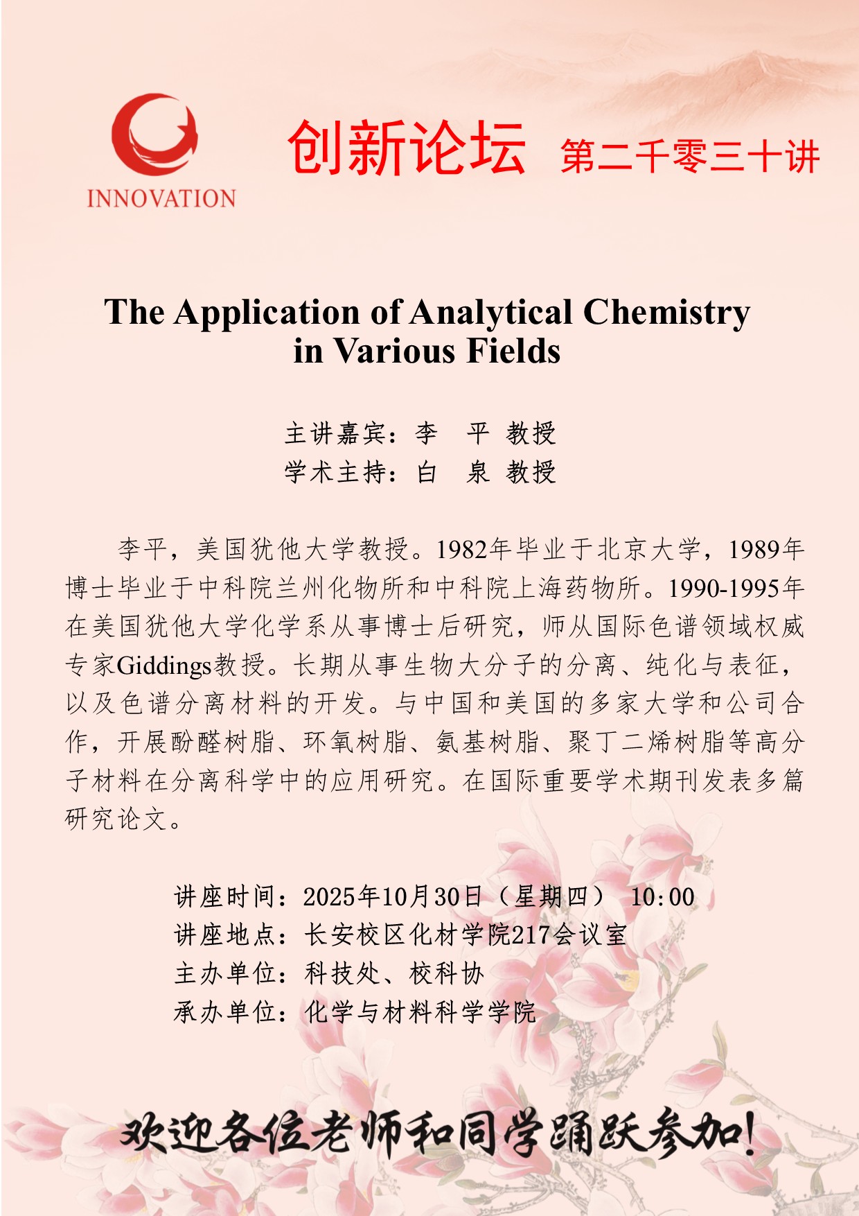 李 平 教授 必赢3003no1线路检测中心创新论坛第二千零三十讲:The Application of Analytical Chemistry in Various Fields 讲座时间 2025年10月30日(星期四) 10:00 讲座地点 长安校区化材学院217会议室 讲座人介绍 李 平 教授 讲座内容