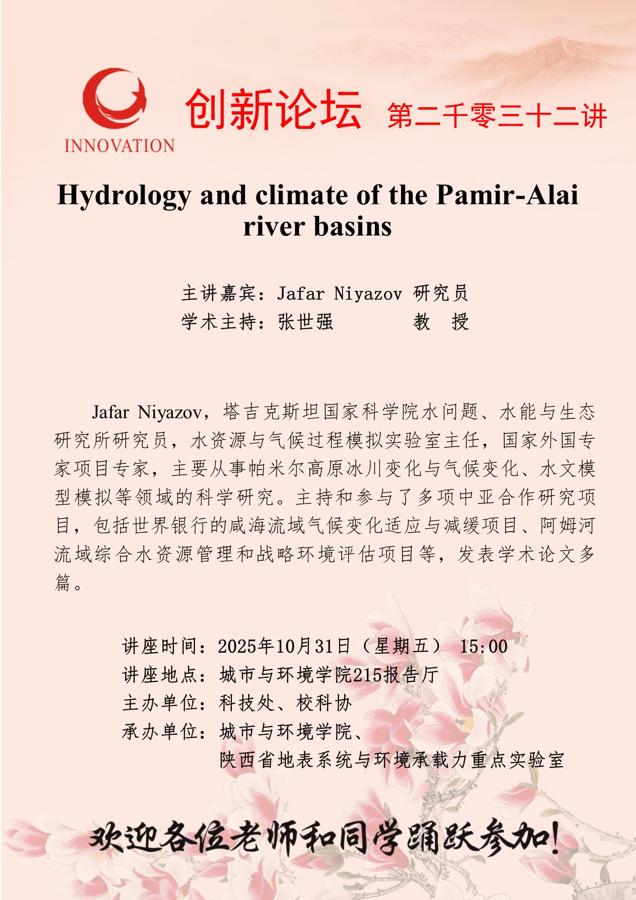 Jafar Niyazov 研究员 必赢3003no1线路检测中心创新论坛第二千零三十二讲:Hydrology and climate of the Pamir-Alai river basins 讲座时间 2025年10月31日(星期五) 15:00 讲座地点 城市与环境学院215报告厅 讲座人介绍 Jafar Niyazov 研究员 讲座内容