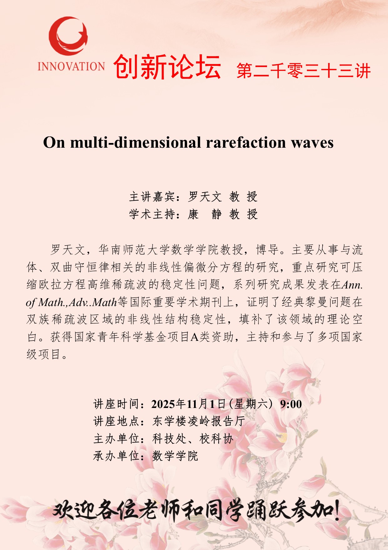 罗天文 教 授 必赢3003no1线路检测中心创新论坛第二千零三十三讲:On multi-dimensional rarefaction waves 讲座时间 2025年11月1日(星期六) 9:00 讲座地点 东学楼凌岭报告厅 讲座人介绍 罗天文 教 授 讲座内容