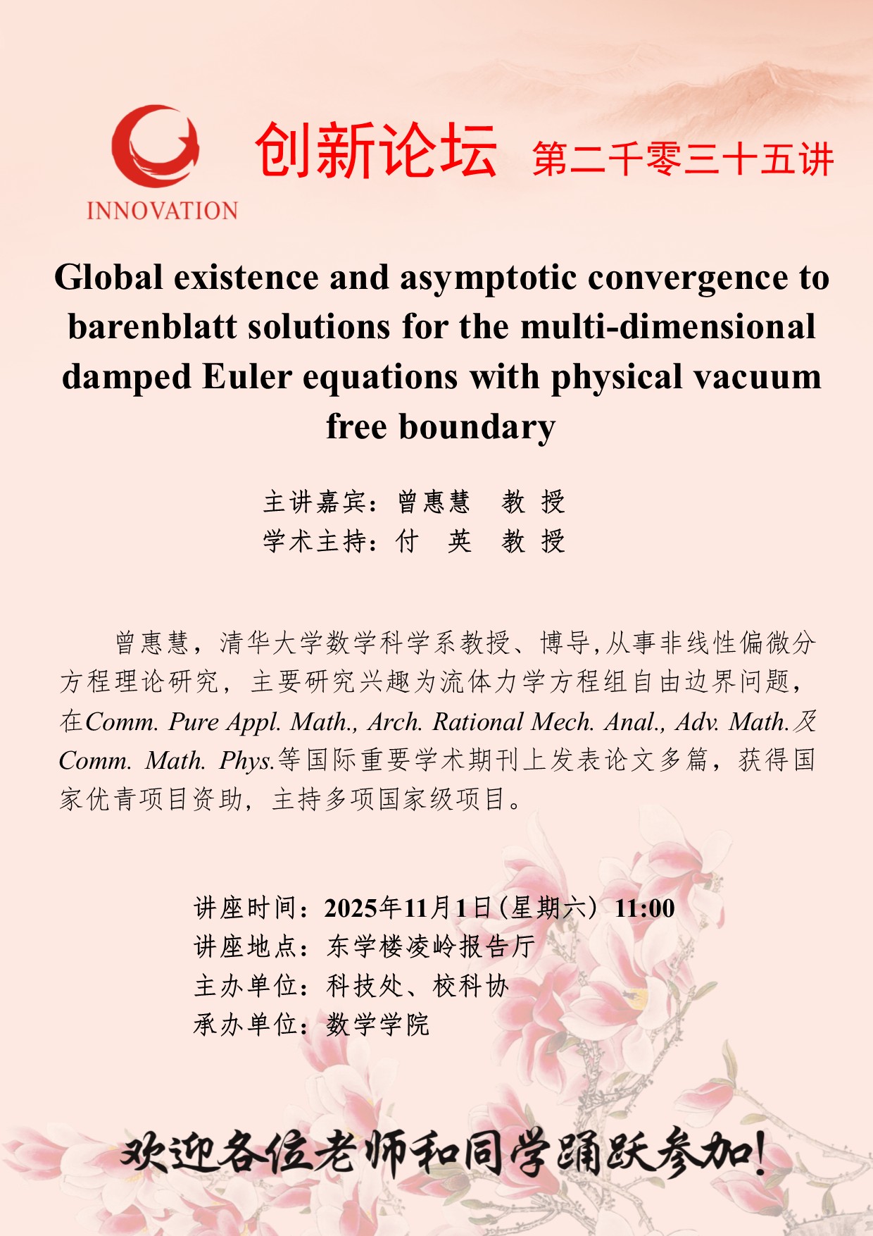 曾惠慧 教 授 必赢3003no1线路检测中心创新论坛第二千零三十五讲:Global existence and asymptotic convergence to barenblatt solutions for the multi-dimensional damped Euler equations with physical vacuum free boundary 讲座时间 2025年11月1日(星期六) 11:00 讲座地点 东学楼凌岭报告厅 讲座人介绍 曾惠慧 教 授 讲座内容