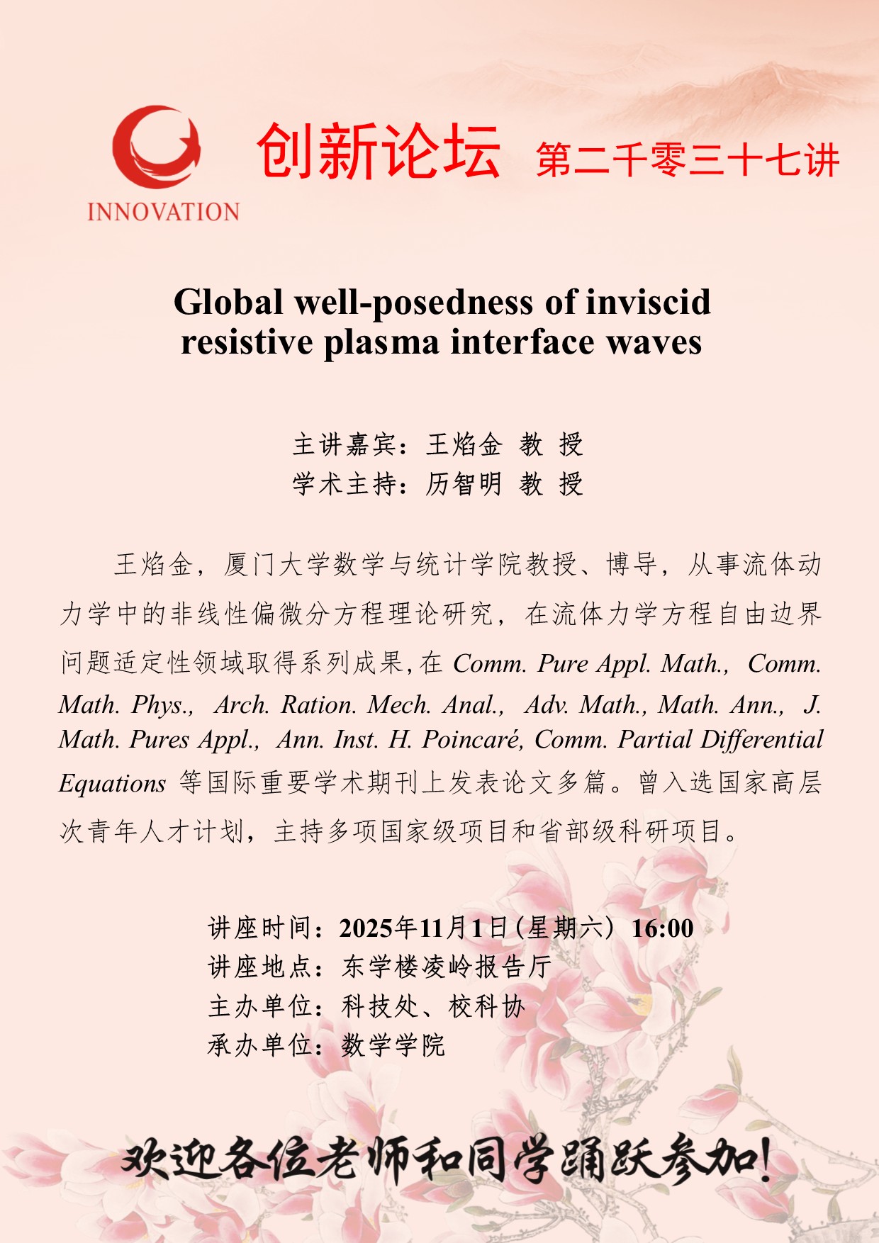 王焰金 教 授 必赢3003no1线路检测中心创新论坛第二千零三十七讲:Global well-posedness of inviscid resistive plasma interface waves 讲座时间 2025年11月1日(星期六) 16:00 讲座地点 东学楼凌岭报告厅 讲座人介绍 王焰金 教 授 讲座内容