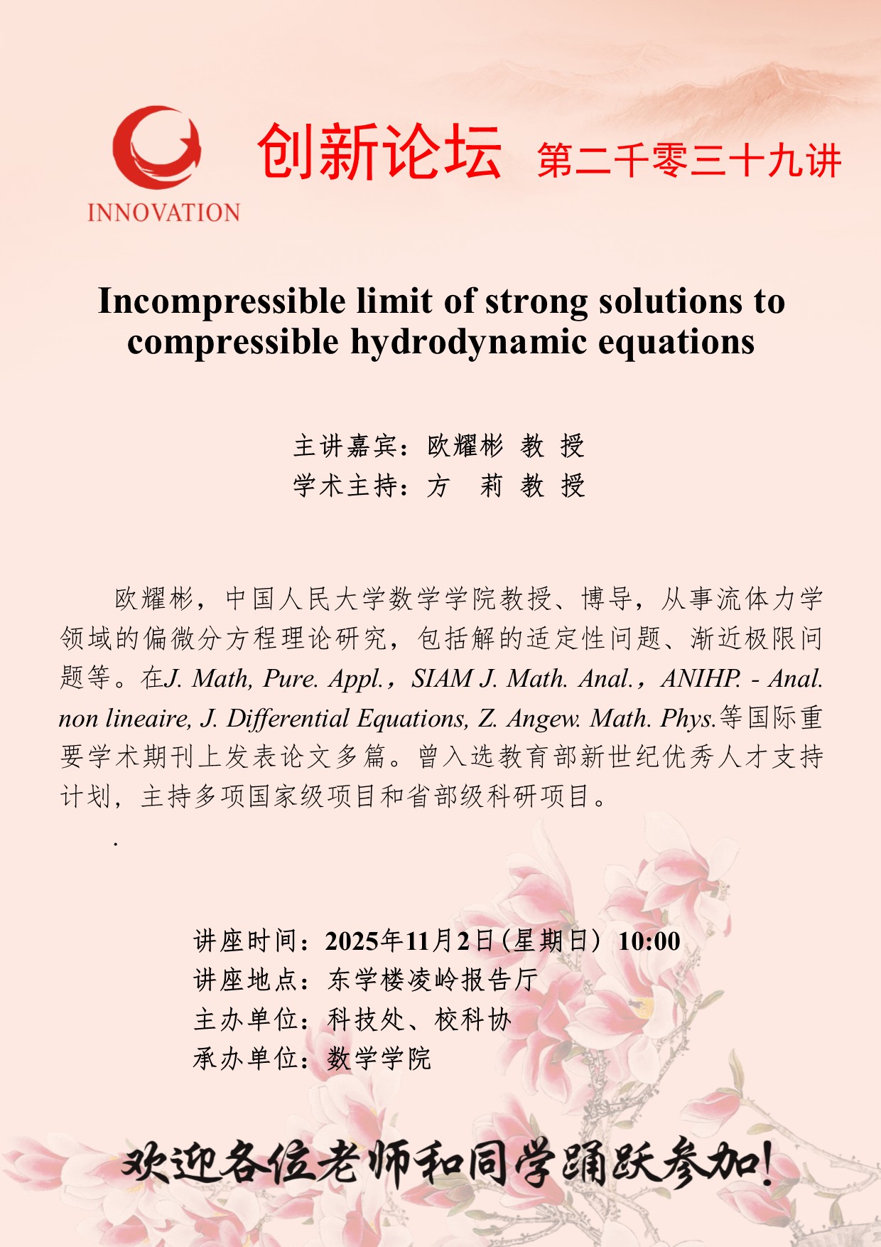 欧耀彬 教 授 必赢3003no1线路检测中心创新论坛第二千零三十九讲:Incompressible limit of strong solutions to compressible hydrodynamic equations 讲座时间 2025年11月2日(星期日) 10:00 讲座地点 东学楼凌岭报告厅 讲座人介绍 欧耀彬 教 授 讲座内容