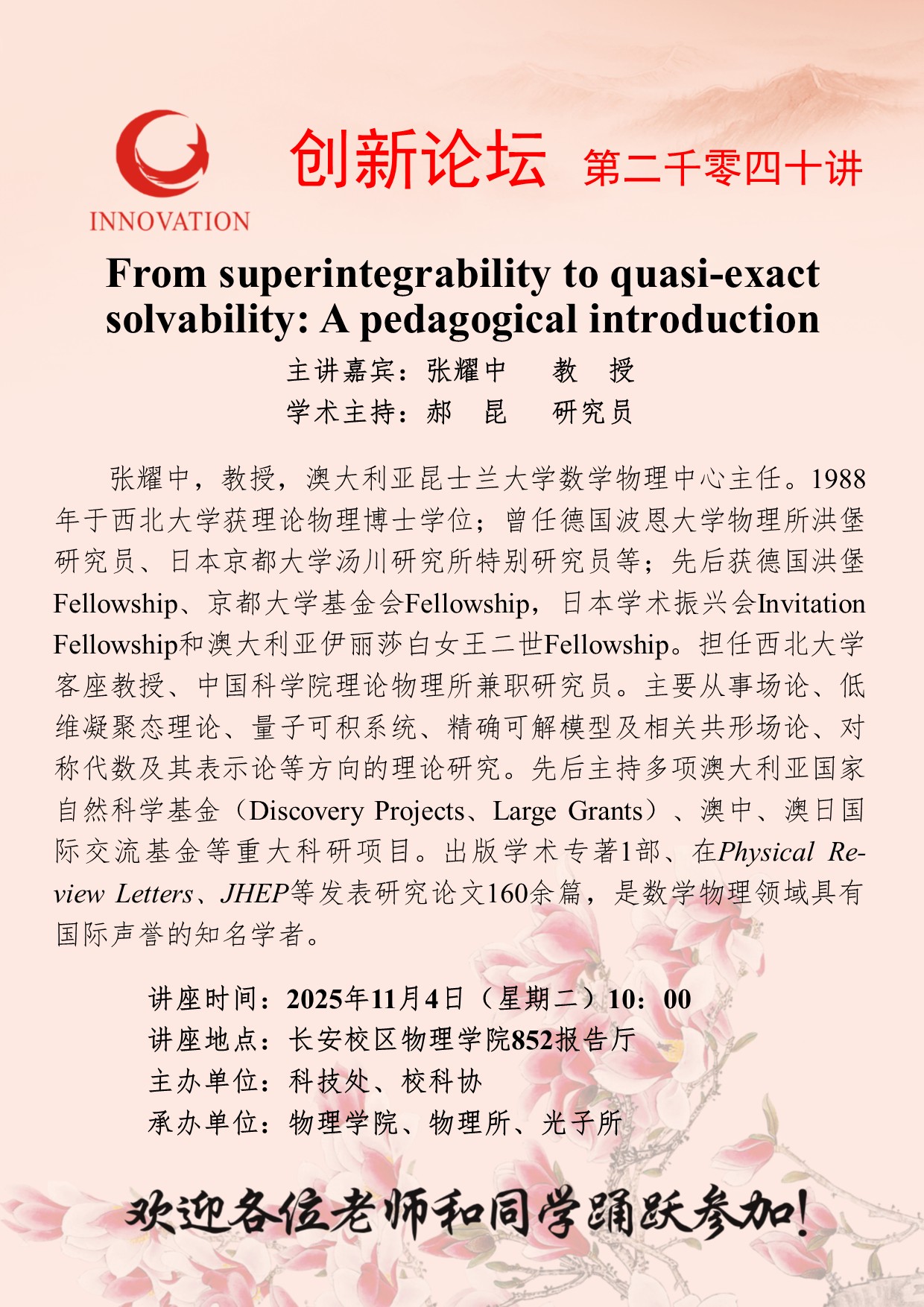 张耀中 教授 必赢3003no1线路检测中心创新论坛第二千零四十讲:From superintegrability to quasi-exact solvability: A pedagogical introduction 讲座时间 2025年11月4日(星期二)10:00 讲座地点 长安校区物理学院852报告厅 讲座人介绍 张耀中 教授 讲座内容