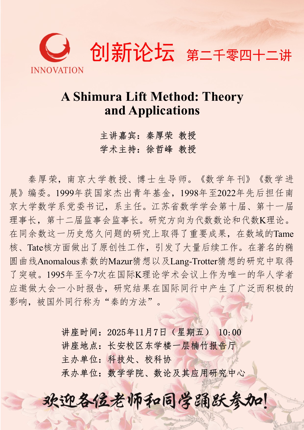 秦厚荣 教授 必赢3003no1线路检测中心创新论坛第二千零四十二讲:A Shimura Lift Method: Theory and Applications 讲座时间 2025年11月7日(星期五) 10:00 讲座地点 长安校区东学楼一层楠竹报告厅 讲座人介绍 秦厚荣 教授 讲座内容