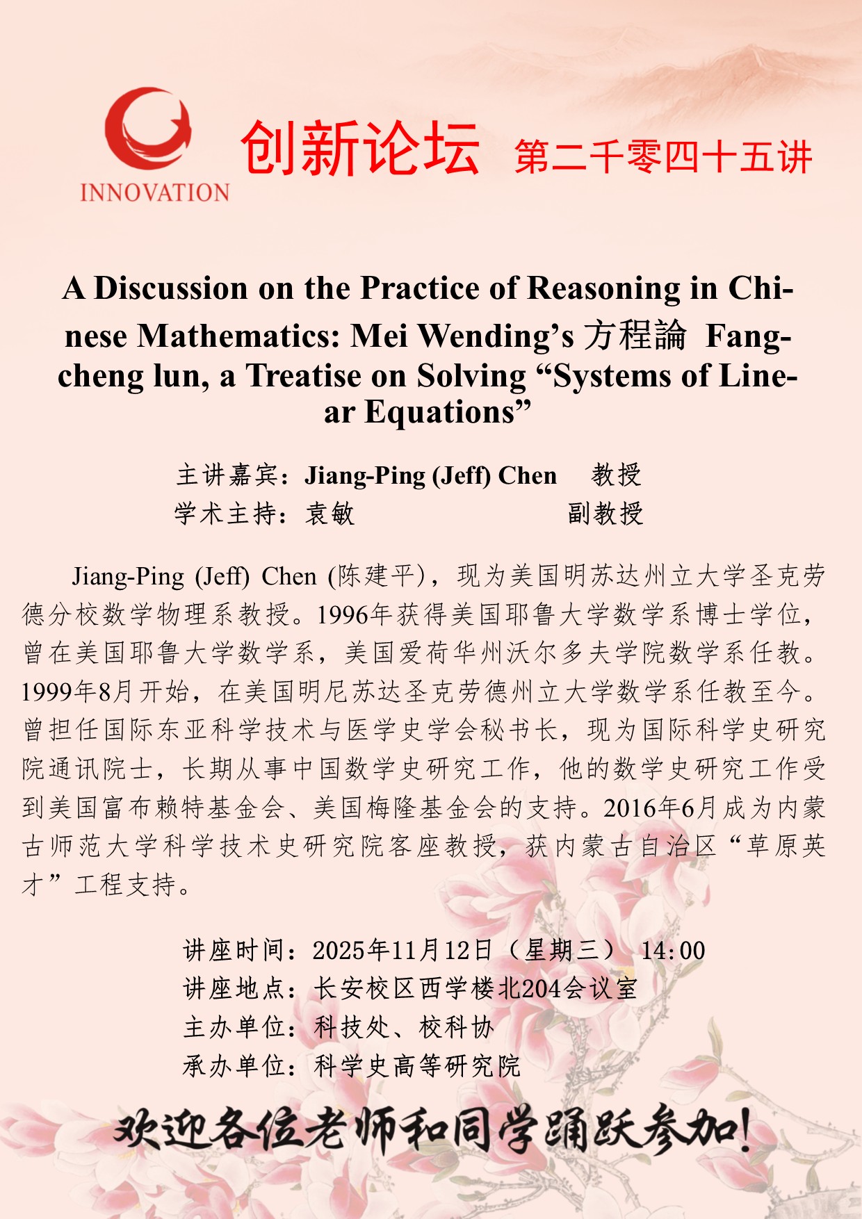 Jiang-Ping (Jeff) Chen 教授 必赢3003no1线路检测中心创新论坛第二千零四十五讲:A Discussion on the Practice of Reasoning in Chinese Mathematics: Mei Wending’s 方程論 Fangcheng lun, a Treatise on Solving “Systems of Linear Equations” 讲座时间 2025年11月12日(星期三) 14:00 讲座地点 长安校区西学楼北204会议室 讲座人介绍 Jiang-Ping (Jeff) Chen 教授 讲座内容